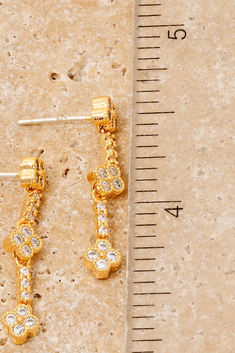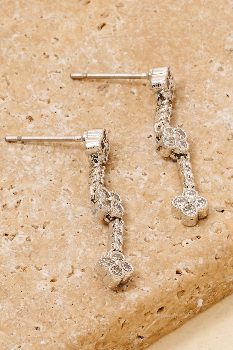 • This pair of dangle earrings introduces a unique cubic zirconia pave clover chain style. Indulge in the allure of exquisite craftsmanship as this pair of dangle earrings effortlessly adds a touch of luxury to your attire.