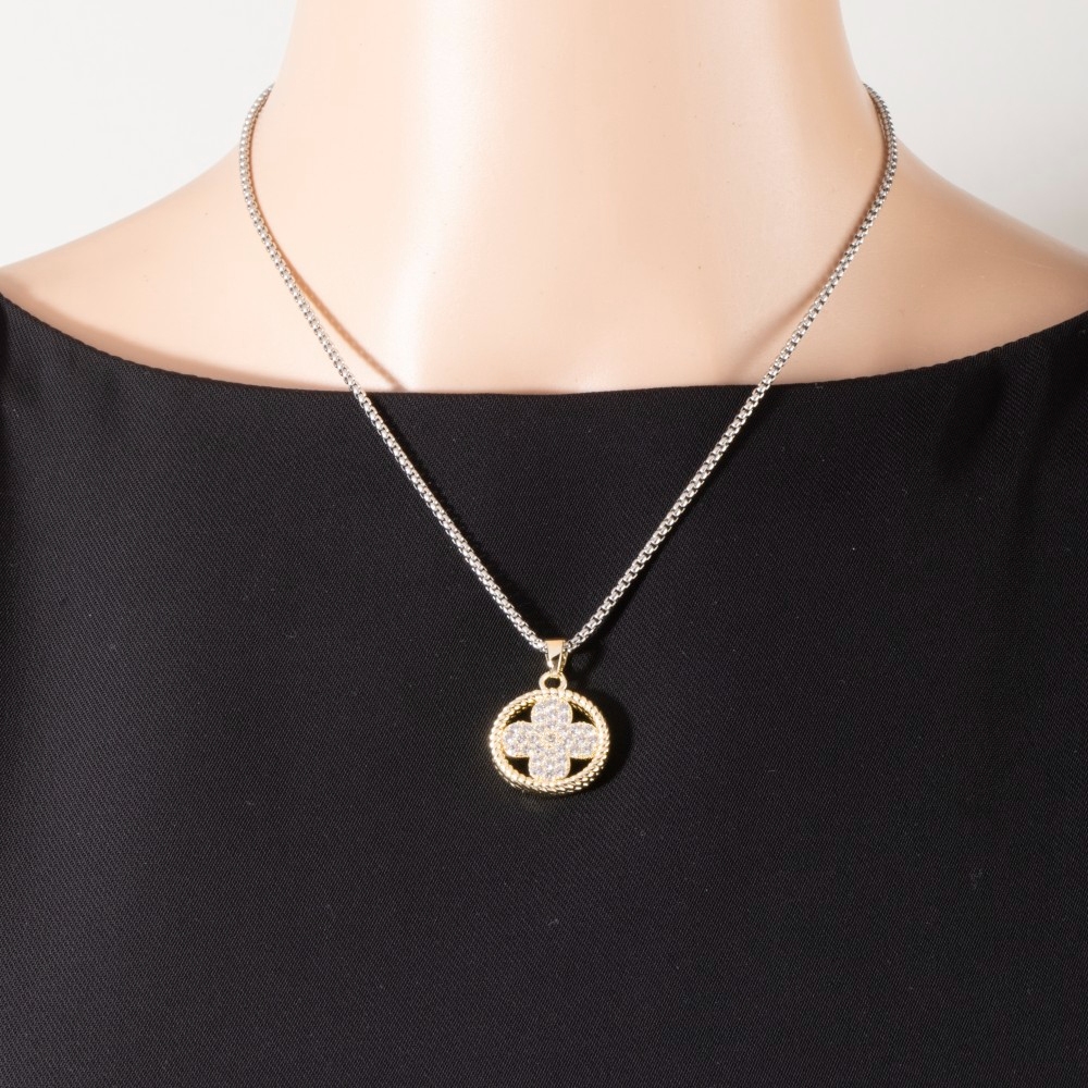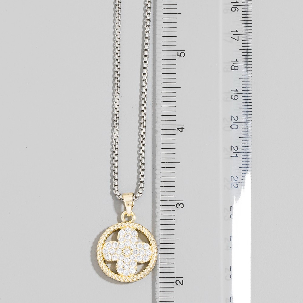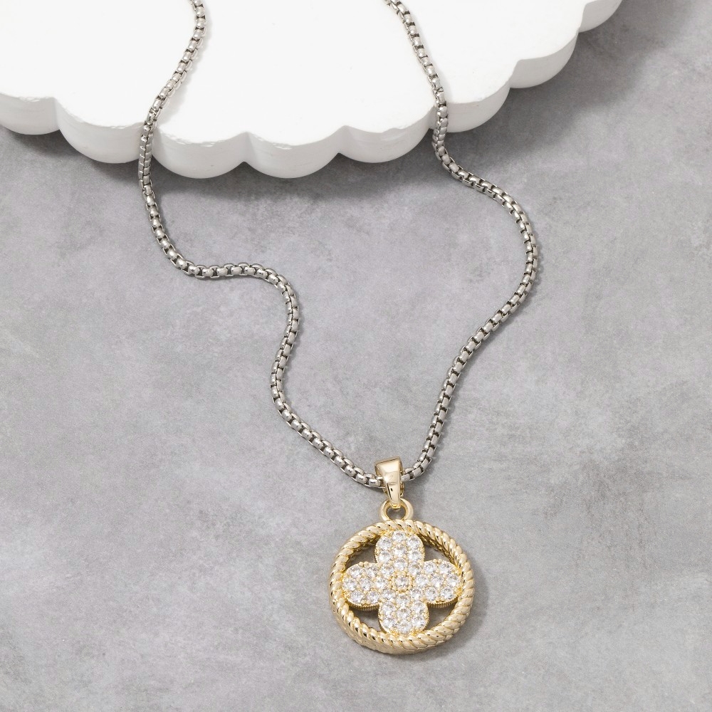 • Sleek and modern, this pendant necklace embodies a sophisticated cz clover rope circle design. This versatile pendant necklace adds a touch of elegance to any outfit. Available in TWOTONE. This item is sold in packs of 1.