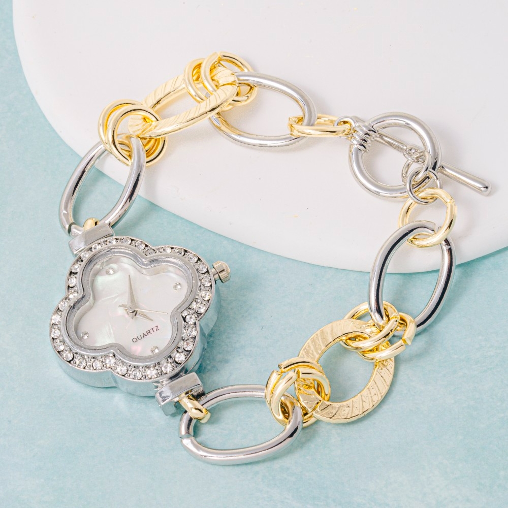 • This piece is the perfect way to add some glamour to your look, this chain bracelet encompasses a grand cz clover two tone toggle design. A chic and sophisticated chain bracelet that's perfect for dressing up or down. This item is sold in packs of 1.