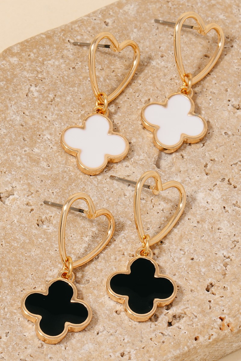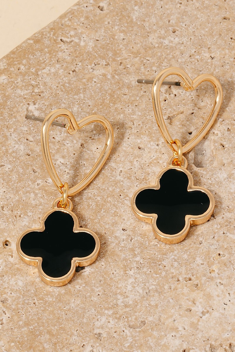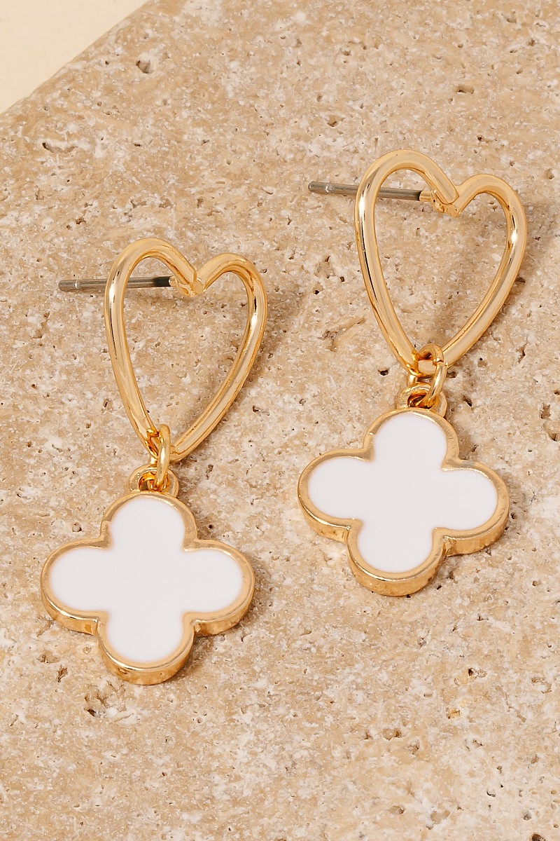 • This pair of drop earrings features a fashionable epoxy clover charm heart stud style. Revel in the intricate design that effortlessly distinguishes this pair of drop earrings, making it a statement piece.