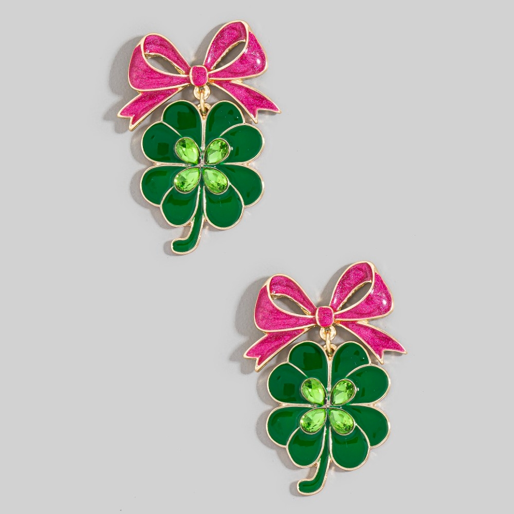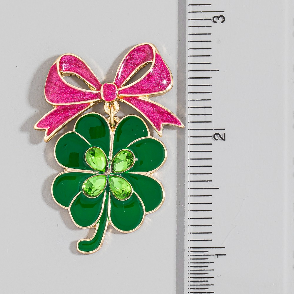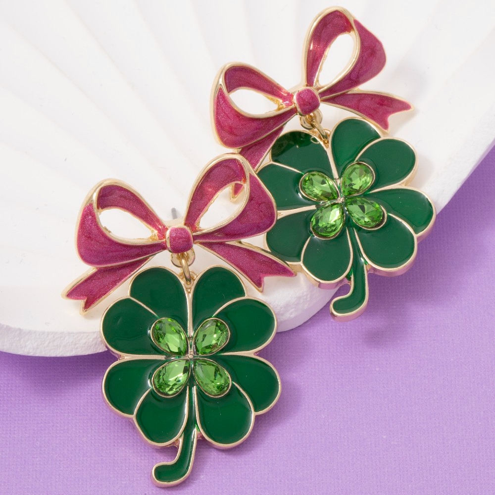 • A true work of art, this pair of dangle earrings exudes a refined enamel bow and 4 leaf clover stud design. Redefine your fashion identity with this versatile pair of dangle earrings, a timeless piece that complements any wardrobe. Available in GR. This item is sold in packs of 1.