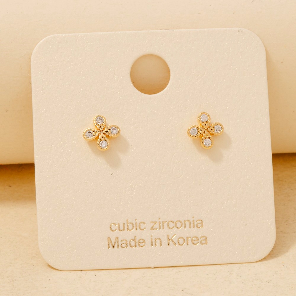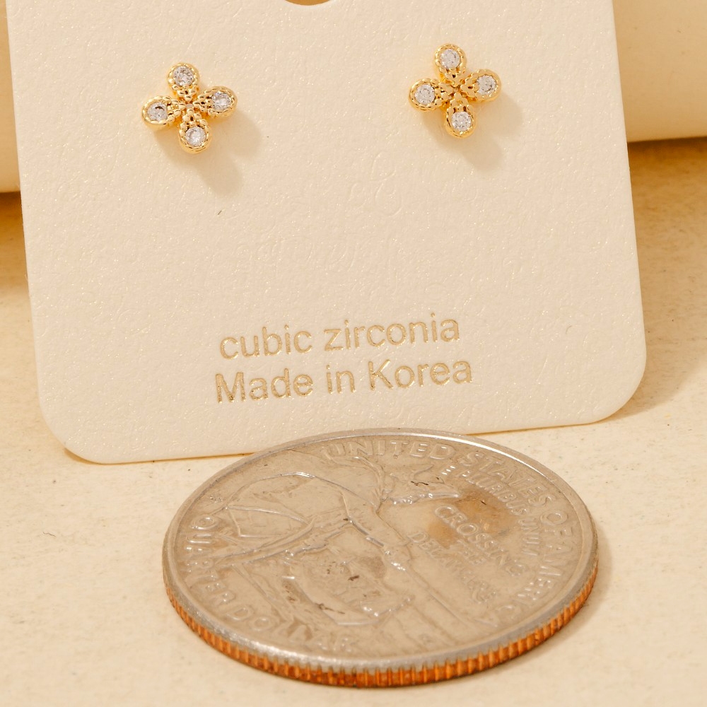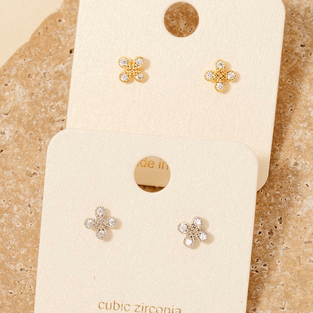 • A versatile piece that can be dressed up or down, this pair of stud earrings contains a special gold dipped mini cubic zirconia flower clover design. Infuse your ensemble with a touch of sophistication using this versatile pair of stud earrings, a game-changer in the world of fashion. Available in G, S. This item is sold in packs of 1.