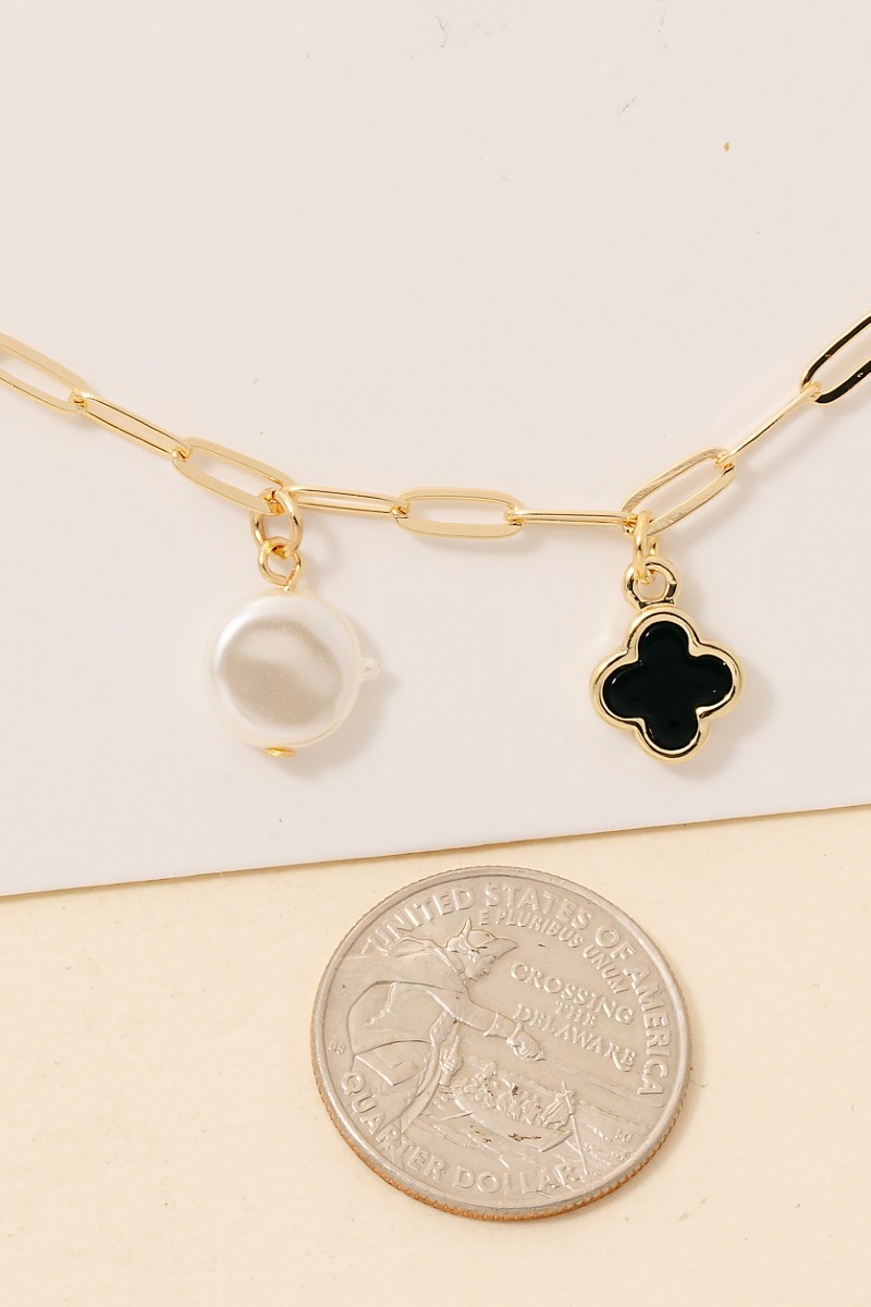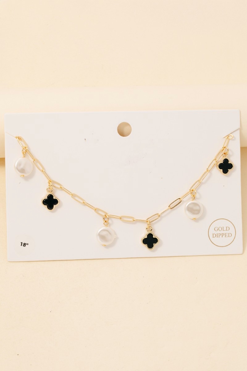 • The epitome of sophistication and style, this chain necklace carries a charming gold dipped pearl and clover charms design. A perfect addition to your wardrobe that effortlessly enhances your style. Available in GDBLK, GDMOP. This item is sold in packs of 1.