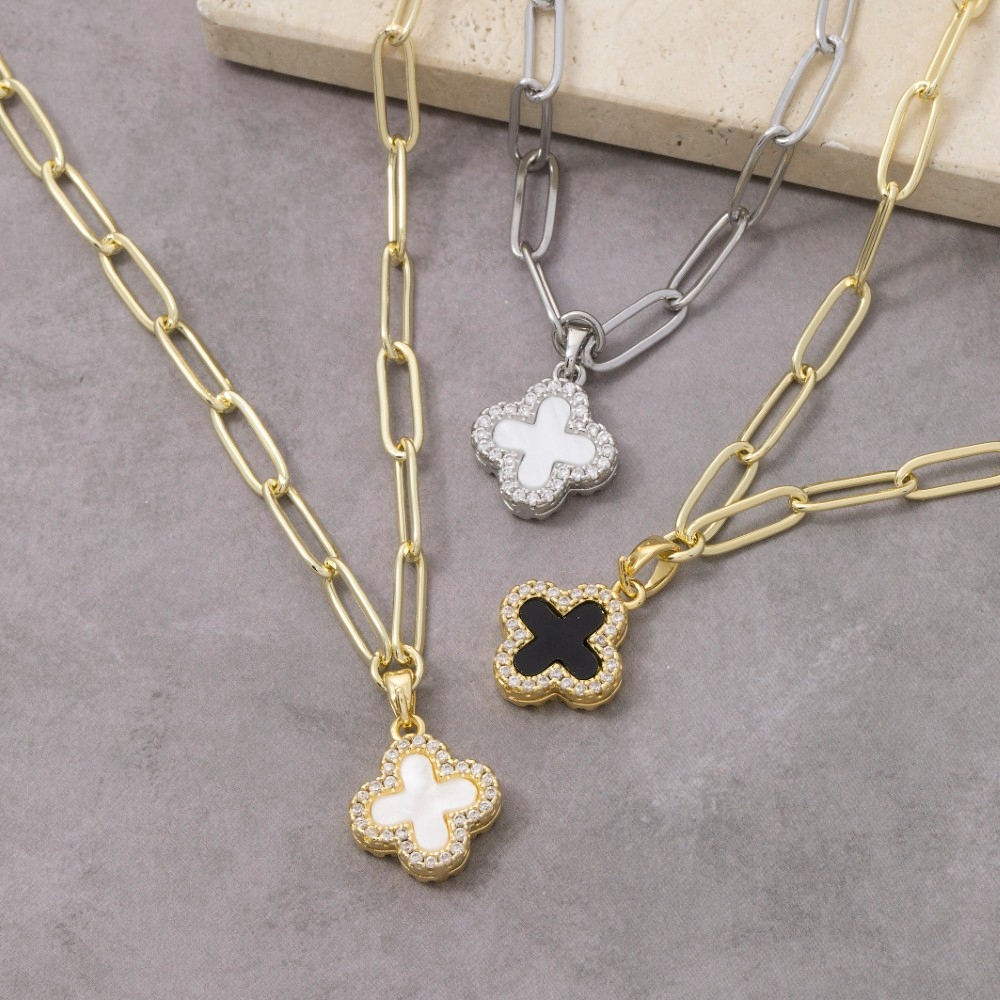 Gold Dipped Two Tone Cz Pave Clover Pendant Necklace