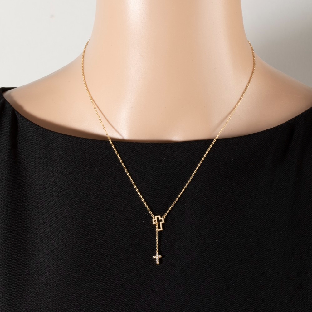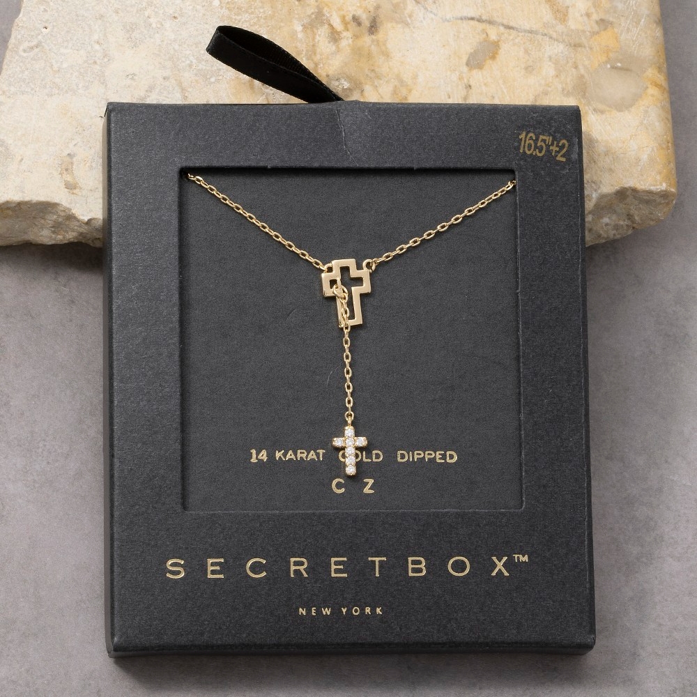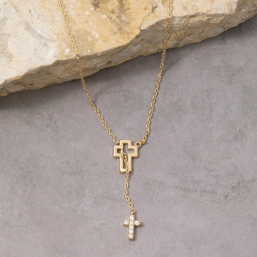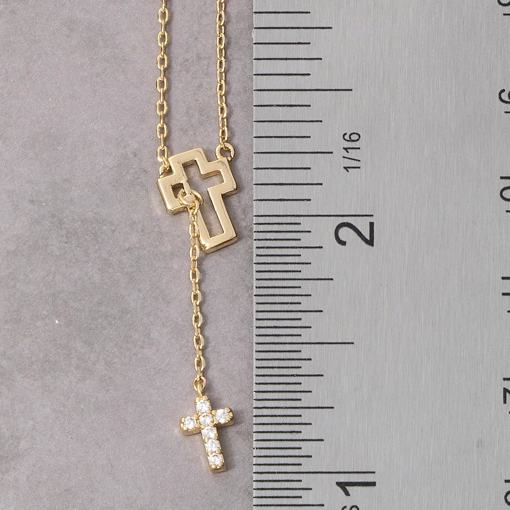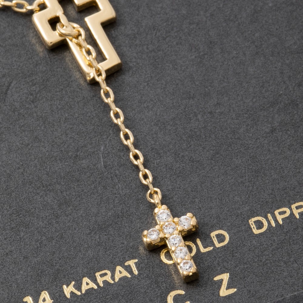 • The epitome of sophistication and style, this necklace features a distinct 14k gold dipped cubic zirconia double cross lariat design. A chic and sophisticated necklace that's perfect for dressing up or down. Available in GD. This item is sold in packs of 1.