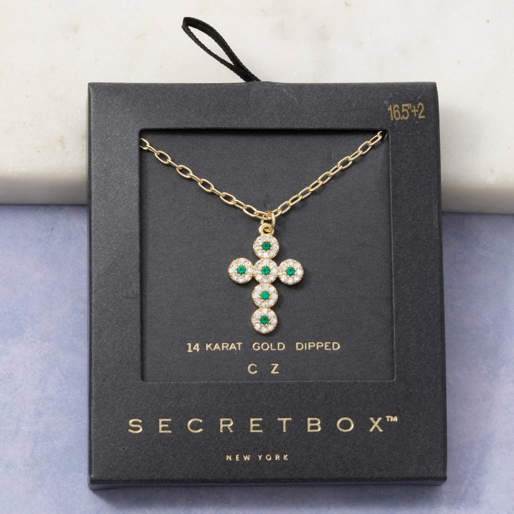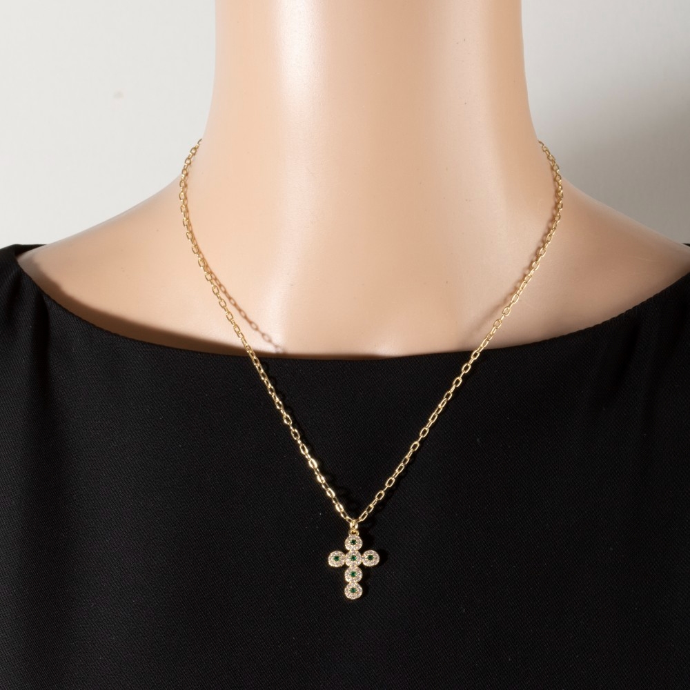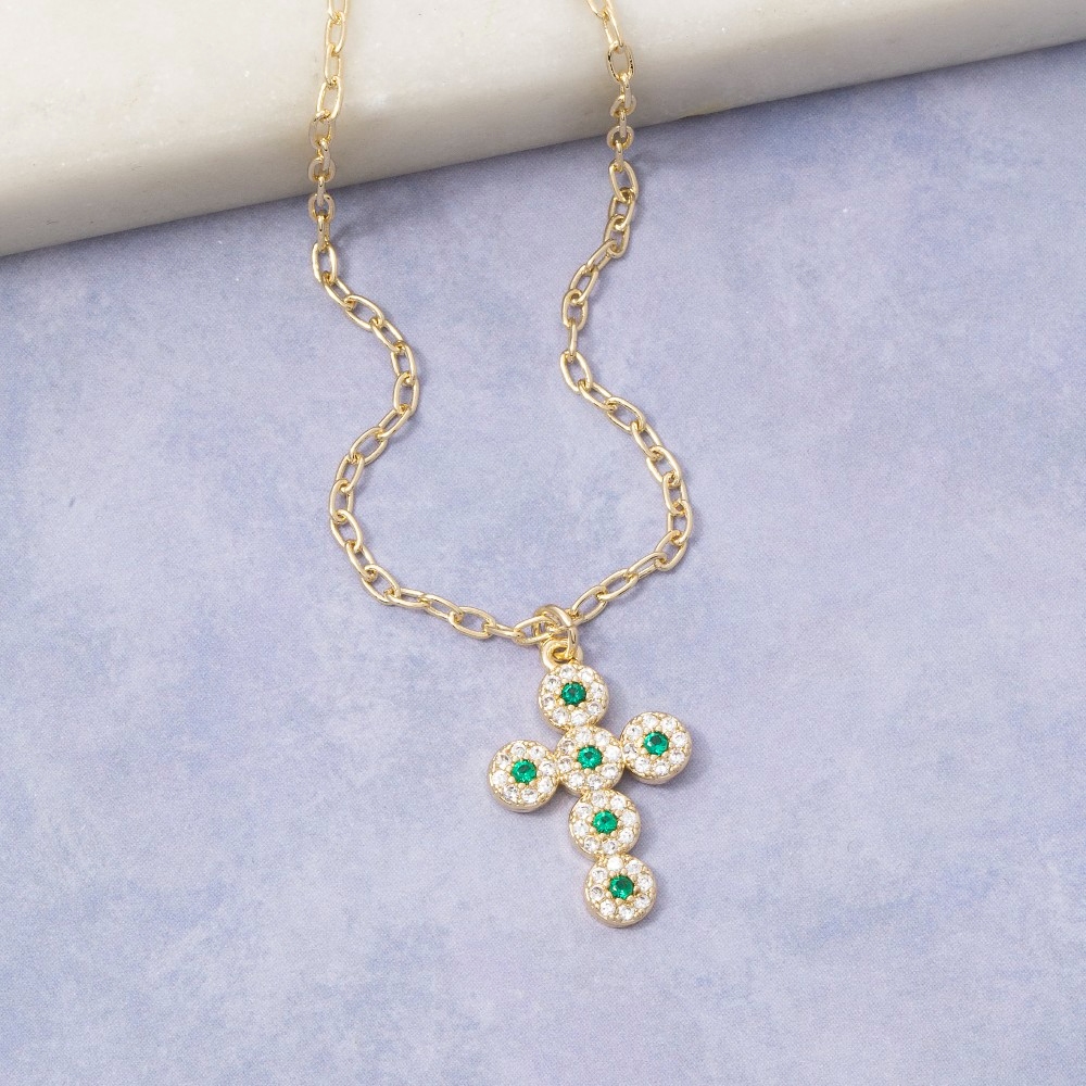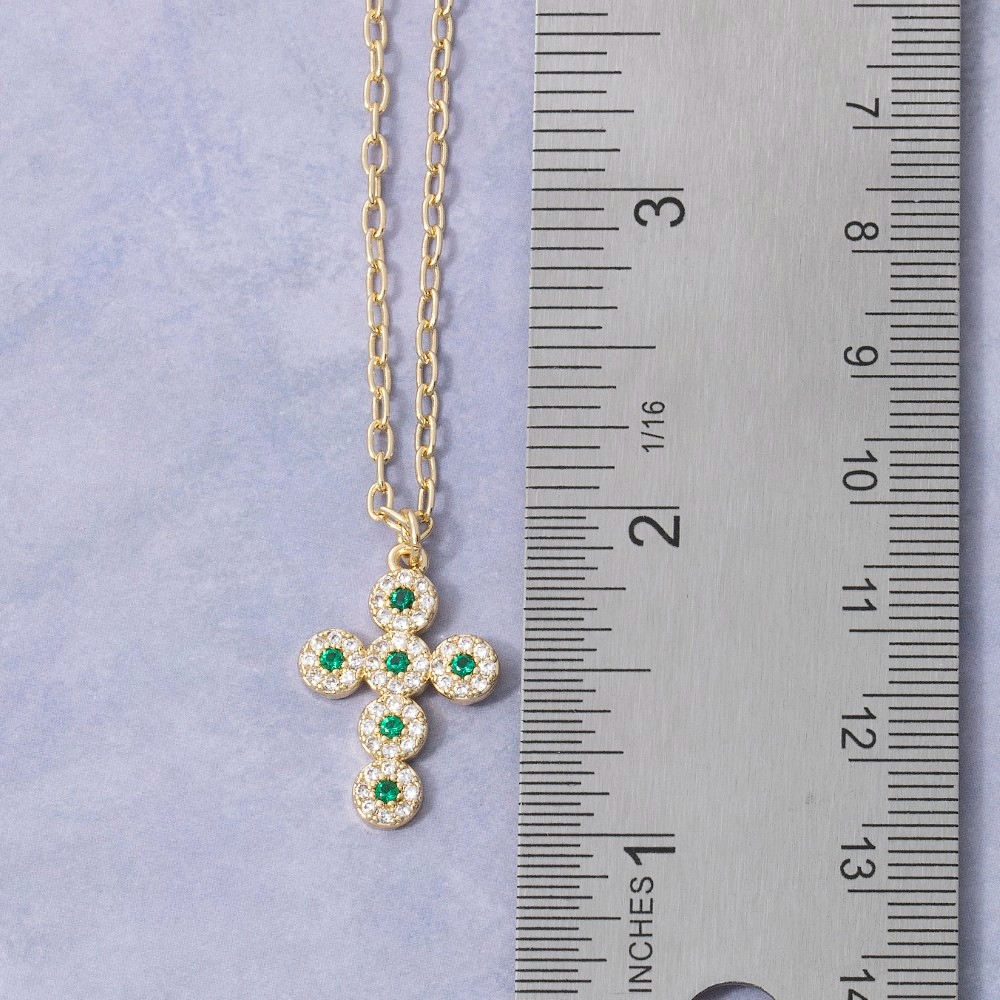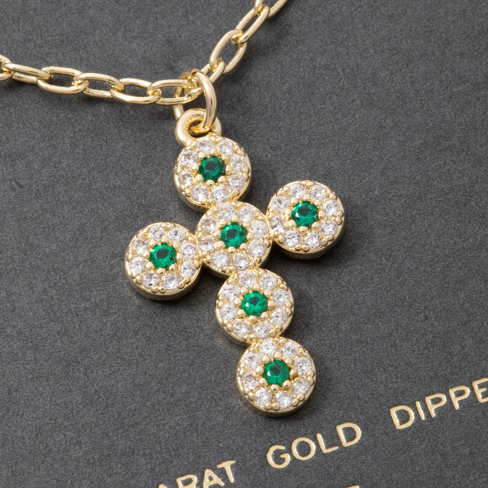 • A contemporary masterpiece, this necklace reveals an intricate 14k gold dipped cubic zirconia emerald cross design. Perfect for dressing up or down, this versatile necklace adds a touch of sophistication to any look. Available in GD. This item is sold in packs of 1.