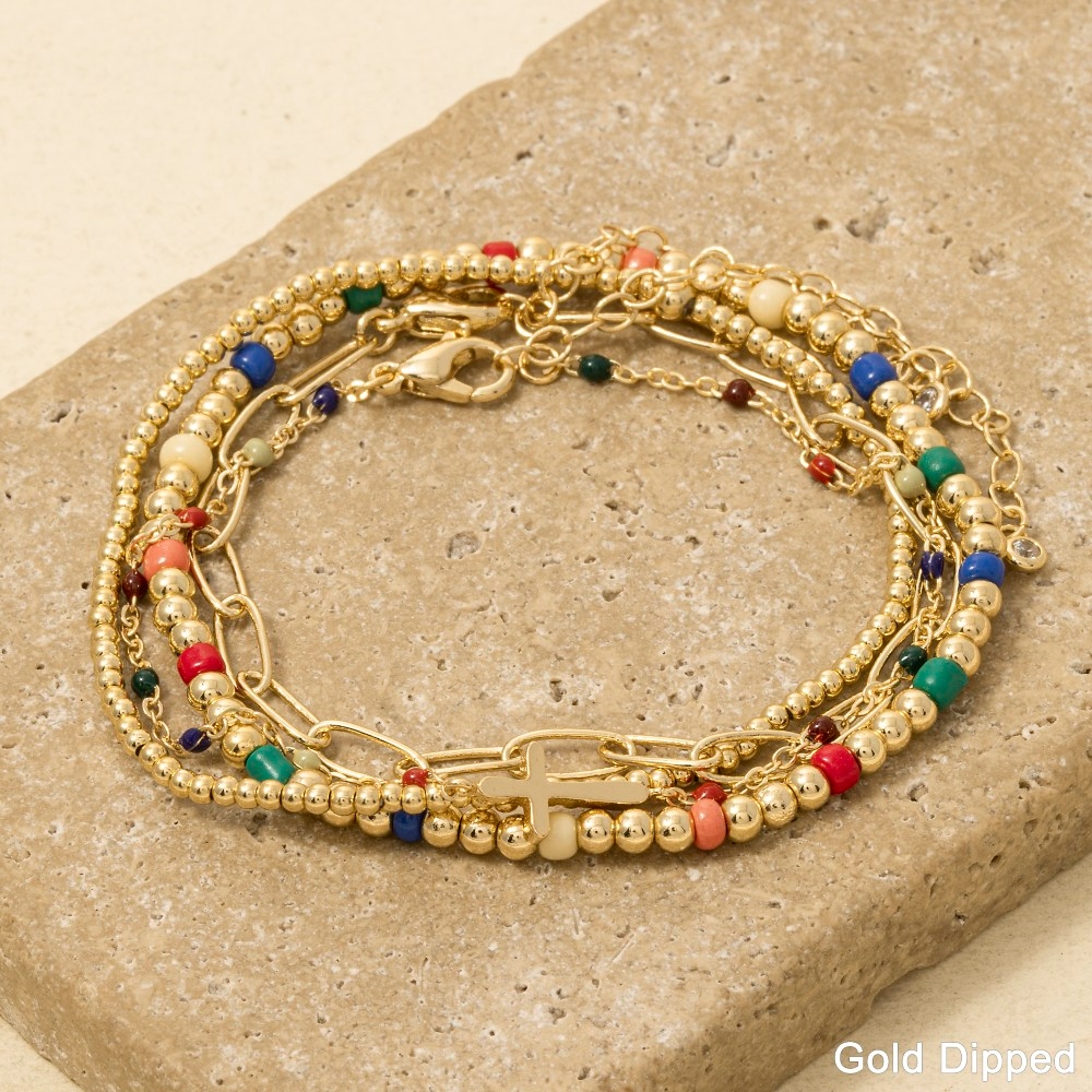 • A stunning addition to any jewelry collection, this bracelet boasts a magnificent cross charm mixed beads and chains design. Perfect for adding a pop of color or texture to any outfit, this bracelet is a must-have. Available in GOLD. This item is sold in packs of 1.