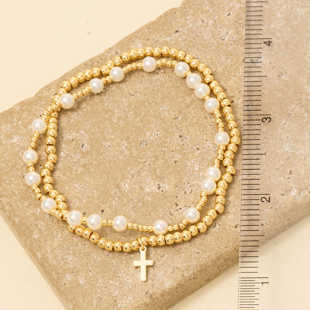 Cross Charm Pearl And Metallic Beaded Bracelet