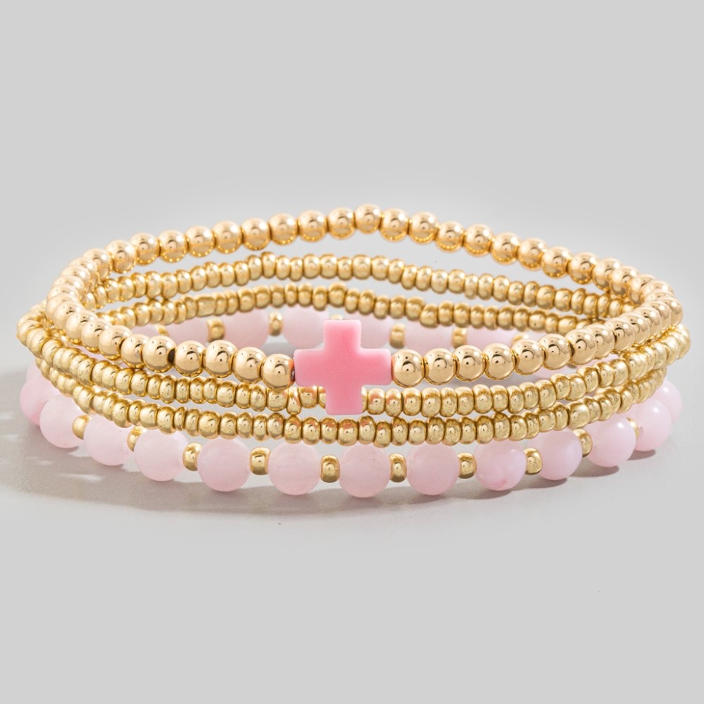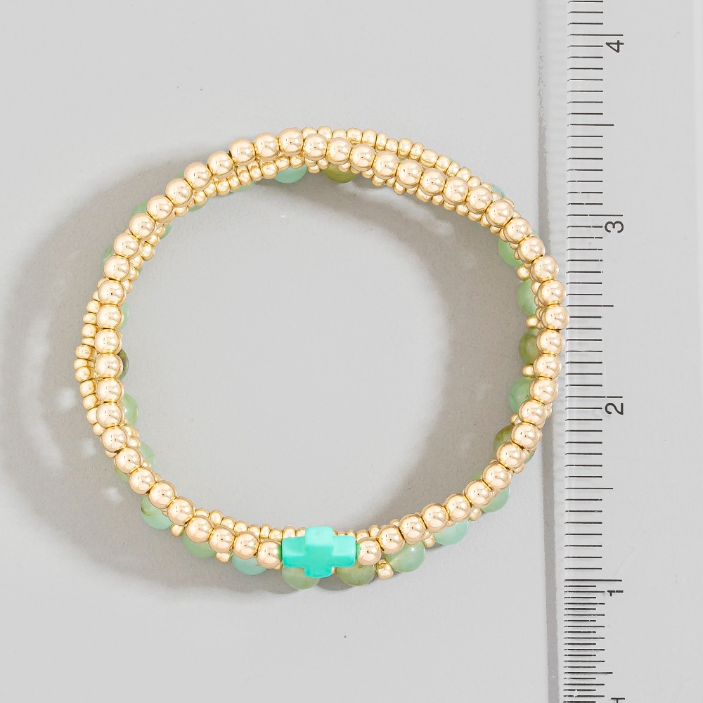 • Elevate your style with something unique and daring, this bracelet offers a remarkable cross charm glass and metallic beaded set design. A must-have bracelet that effortlessly enhances your style, no matter the occasion. Available in GDMINT, GDPNK, GDWHT. This item is sold in packs of 1.