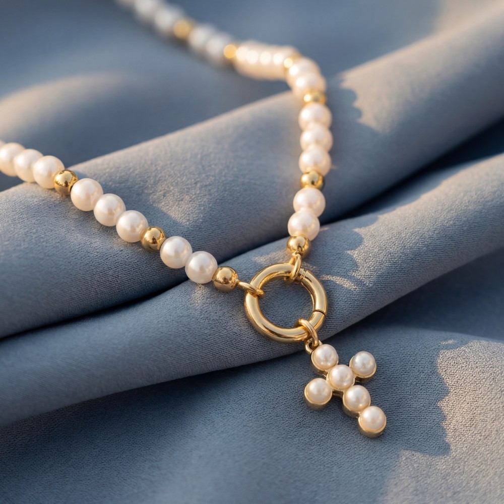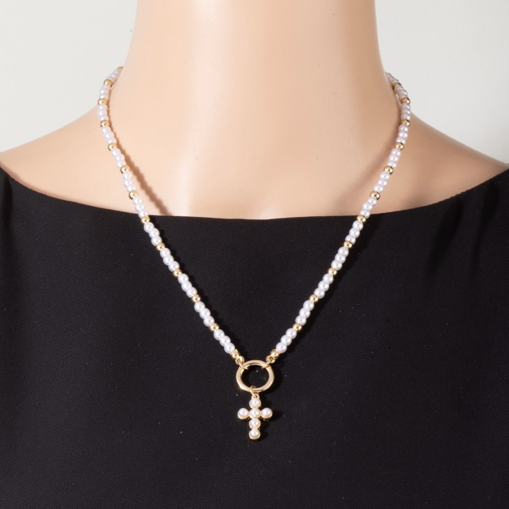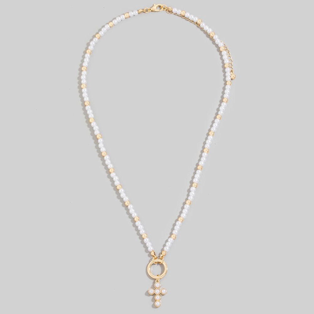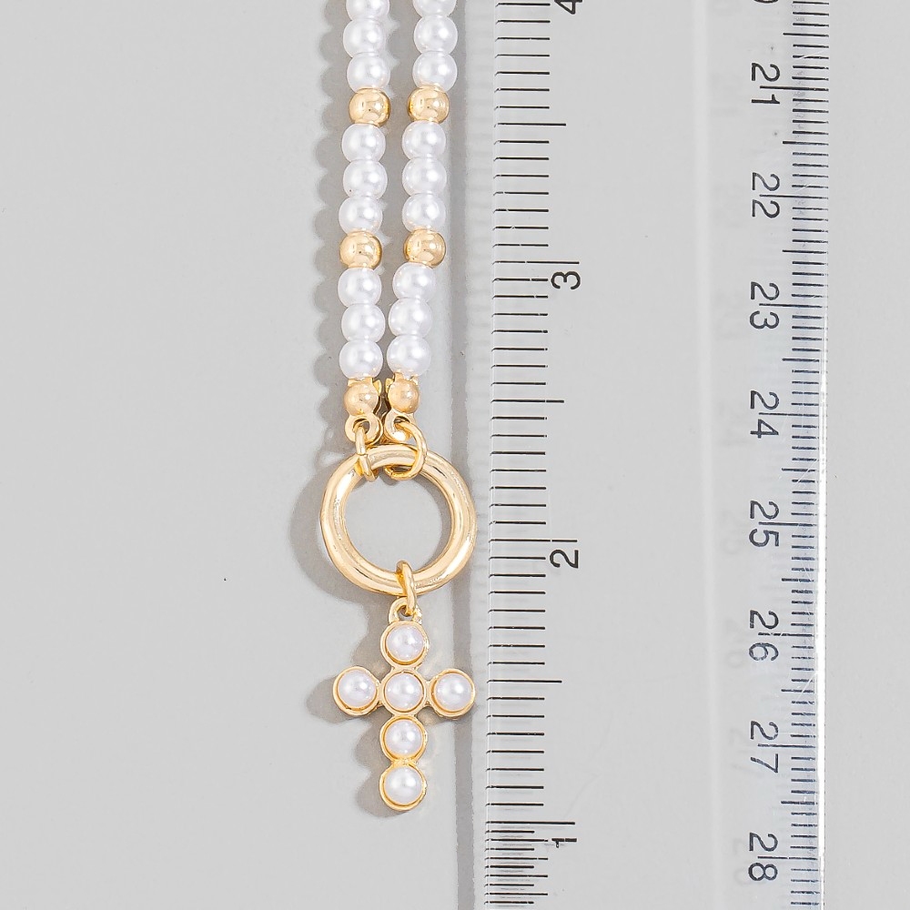 • Effortlessly elevate your outfit, this pendant necklace displays a unique cross pendant pearl and metallic beaded necklace design. This item is the perfect way to add some texture and interest to any outfit. Available in GDCRM. This item is sold in packs of 1.