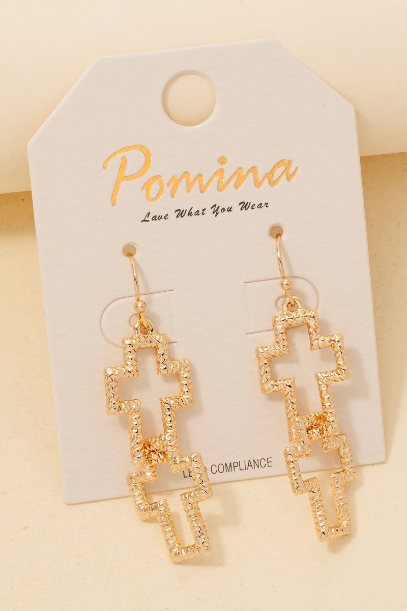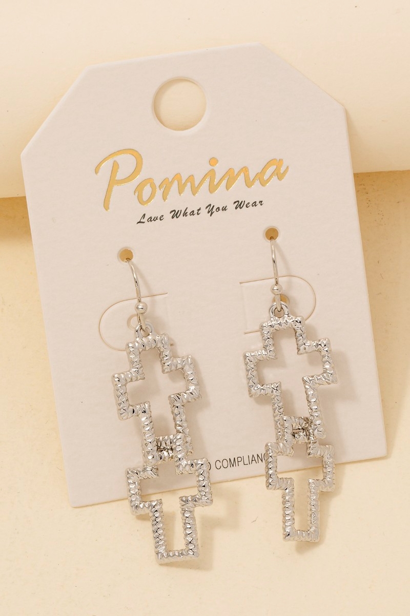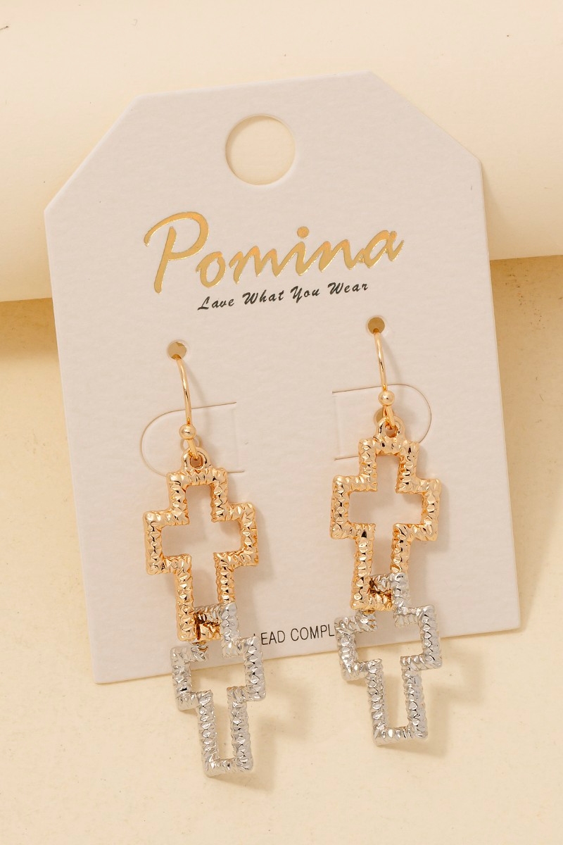 • This pair of earrings adds a modern double textured cross dangle hook style. Experience a subtle blend of modernity and classic charm as this pair of earrings effortlessly adorns your ensemble.