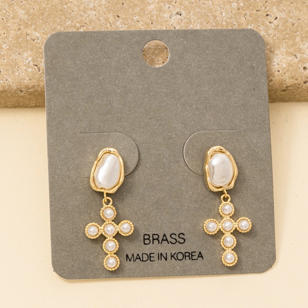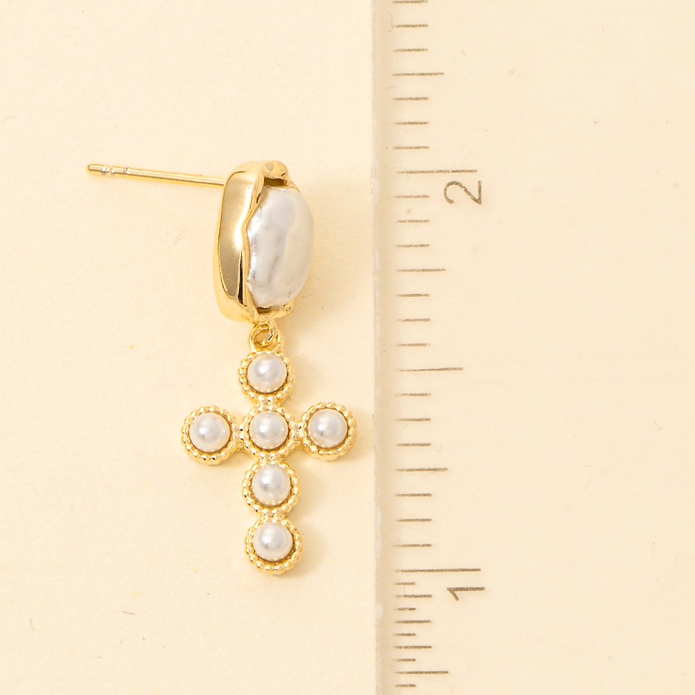 • Effortlessly chic and sophisticated, this pair of dangle earrings displays a unique pearl studded cross design. A must-have pair of dangle earrings for anyone who loves to add some flair to their outfits. Available in GDCRM. This item is sold in packs of 1.