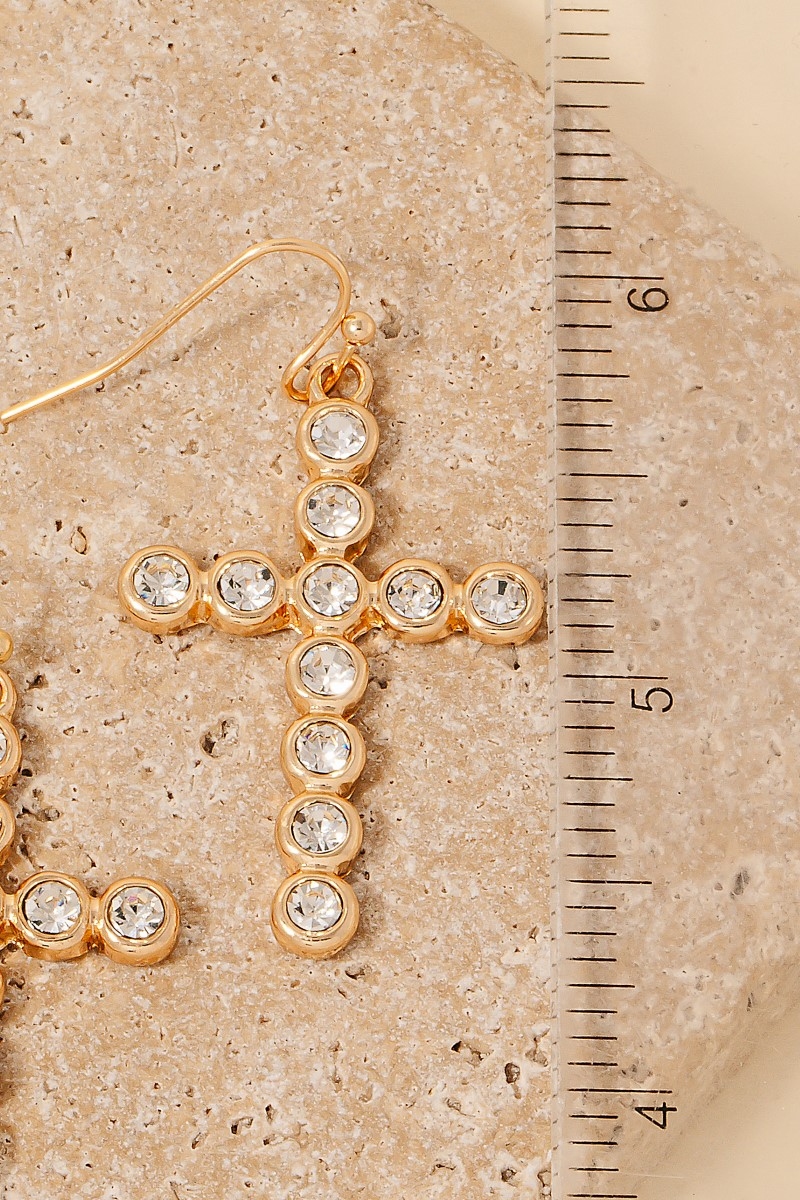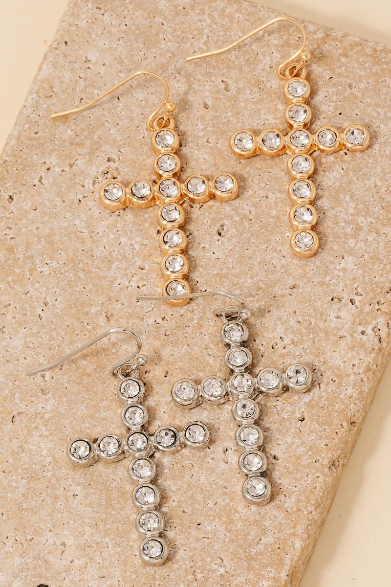 This pair of dangle earrings adds a modern rhinestone pave cross style. Embark on a journey of sartorial refinement as this pair of dangle earrings effortlessly complements your fashion sense.