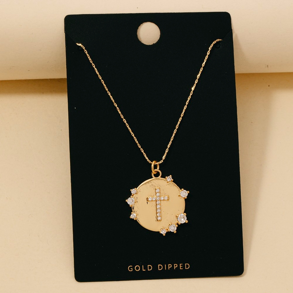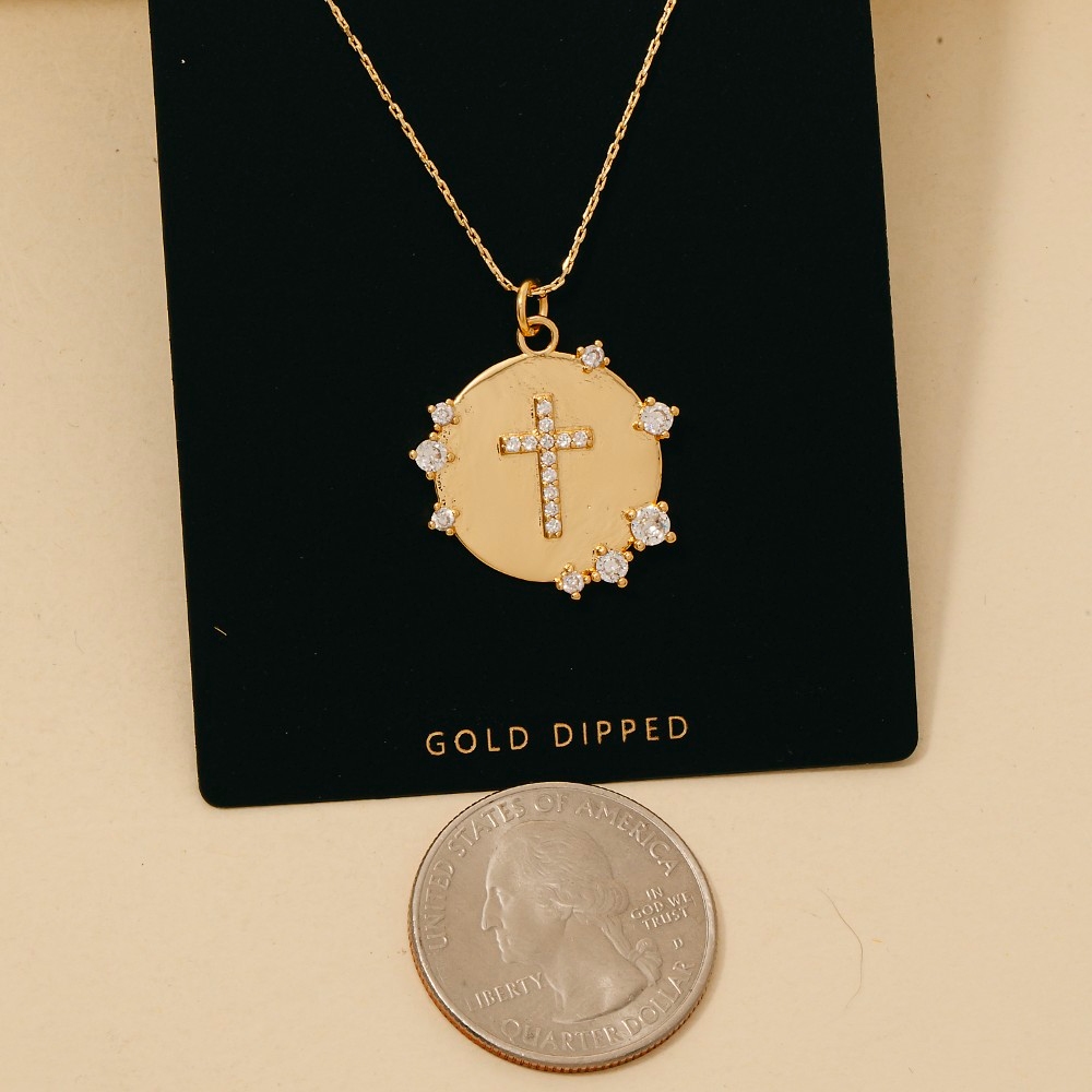 • Perfect for any occasion, from casual to formal, this columbus jewelry necklace showcases an alluring gold dipped cubic zirconia cross coin pendant design. Add some personality to your outfit with this stylish necklace. This item is sold in packs of 1.