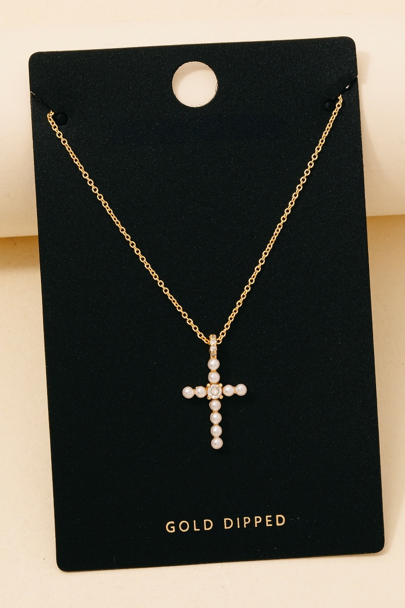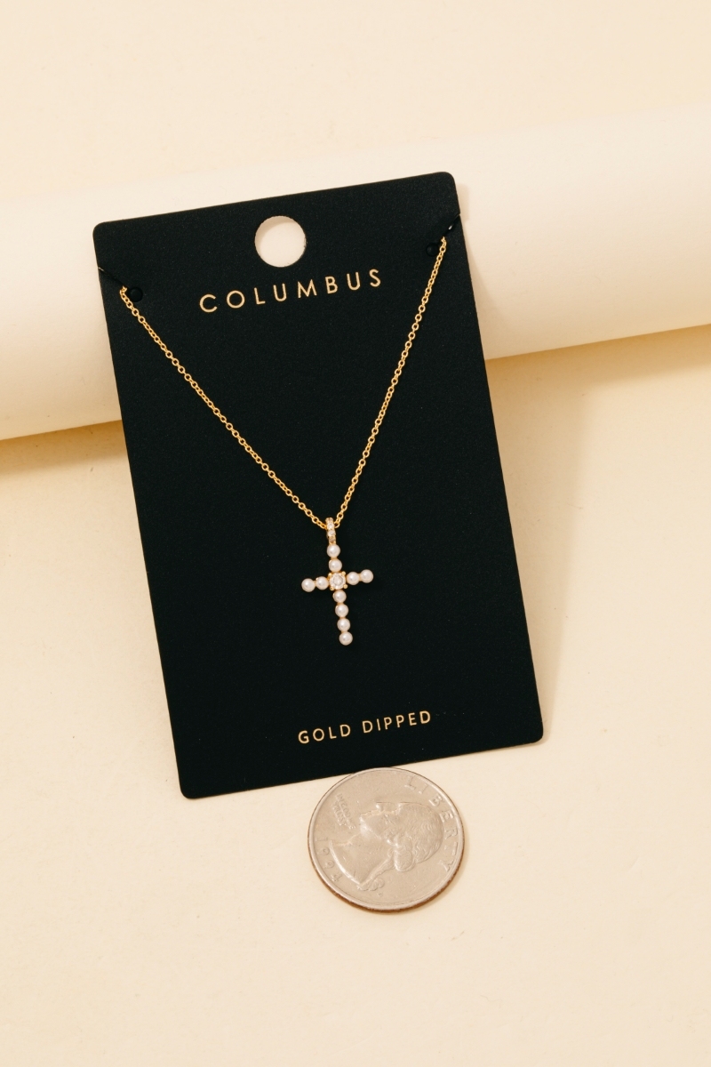 • This season's must-have necklace, this columbus jewelry necklace flaunts a luxurious gold dipped pearl and cubic zirconia studded cross pendant design. Add some personality to your outfit with this stylish necklace. This item is sold in packs of 1.