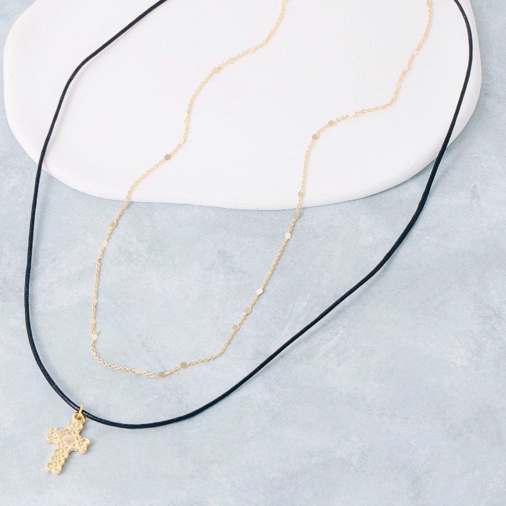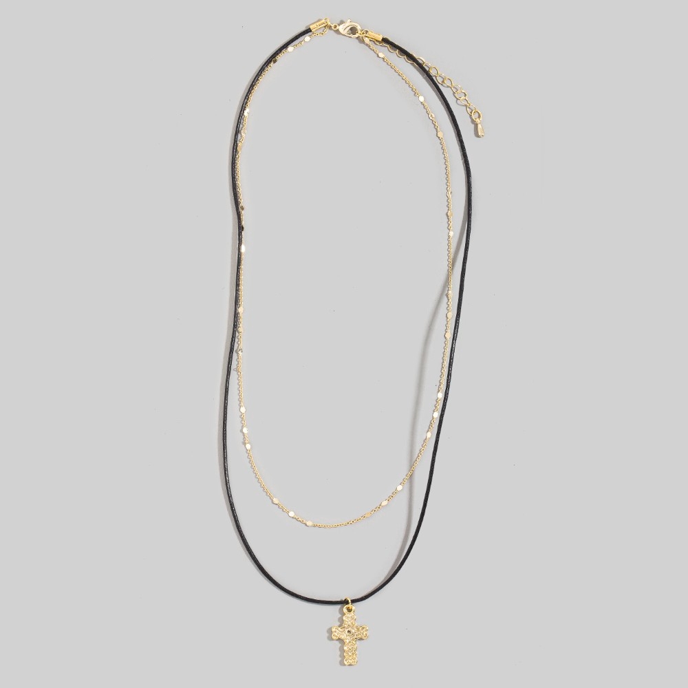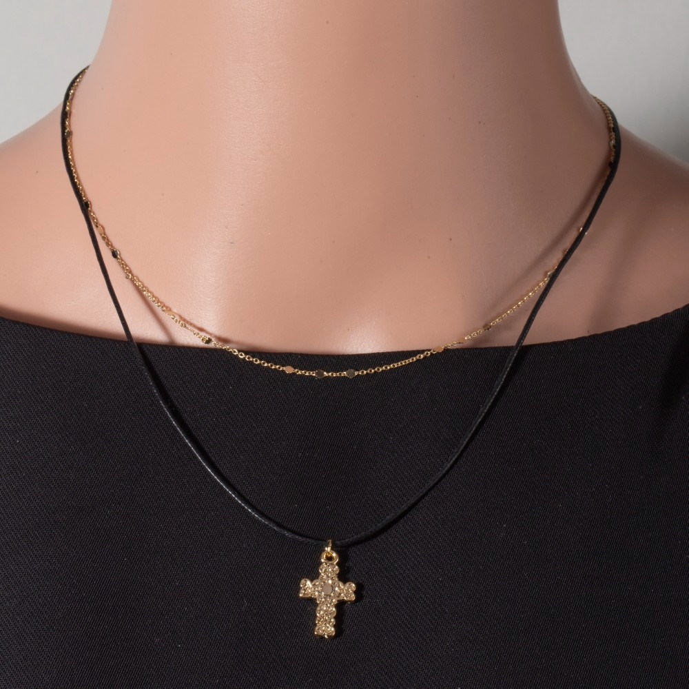 • This piece is designed to be both stylish and functional, this pendant necklace encompasses a grand layered chain cord cross design. A perfect addition to your wardrobe that effortlessly enhances your style. Available in G. This item is sold in packs of 1.