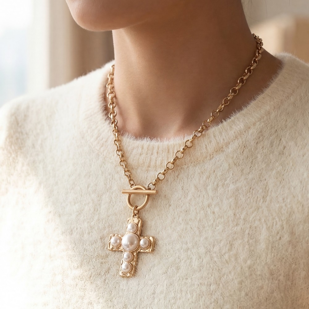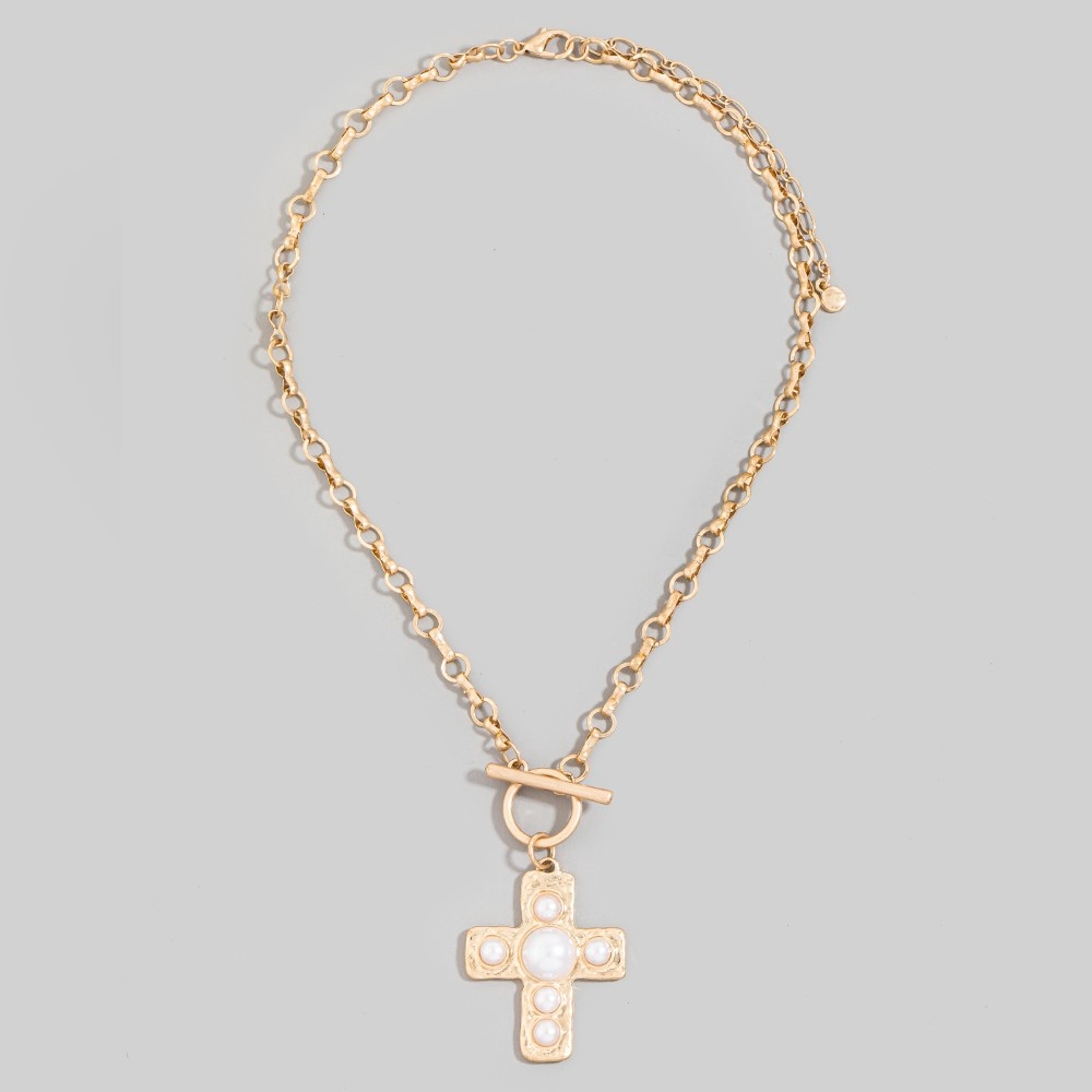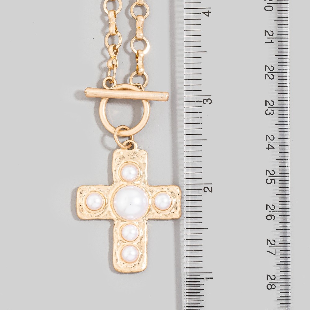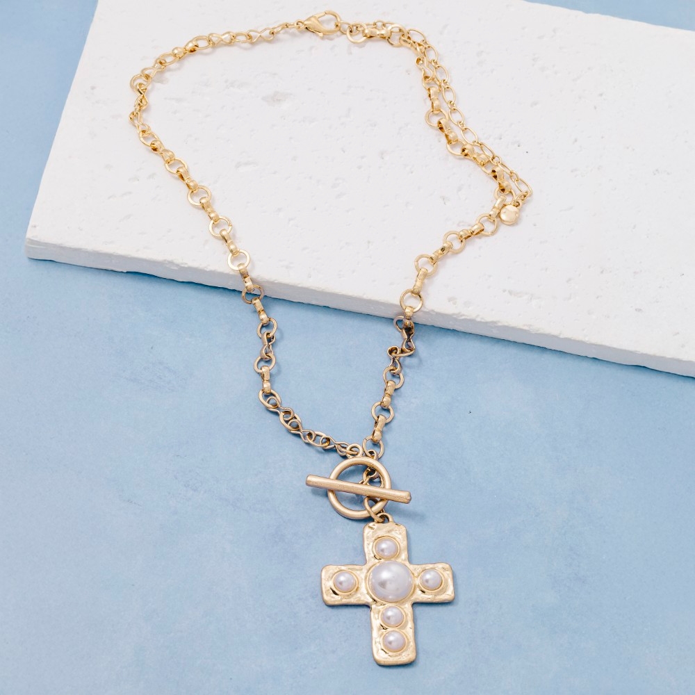 • A classic design with a contemporary twist, this chain necklace possesses a fine pearl studded cross pendant toggle design. Take your style to the next level by incorporating this versatile chain necklace, a key element in achieving a polished look. Available in WG. This item is sold in packs of 1.
