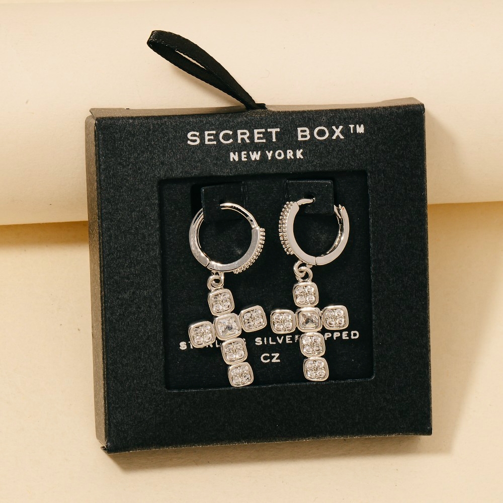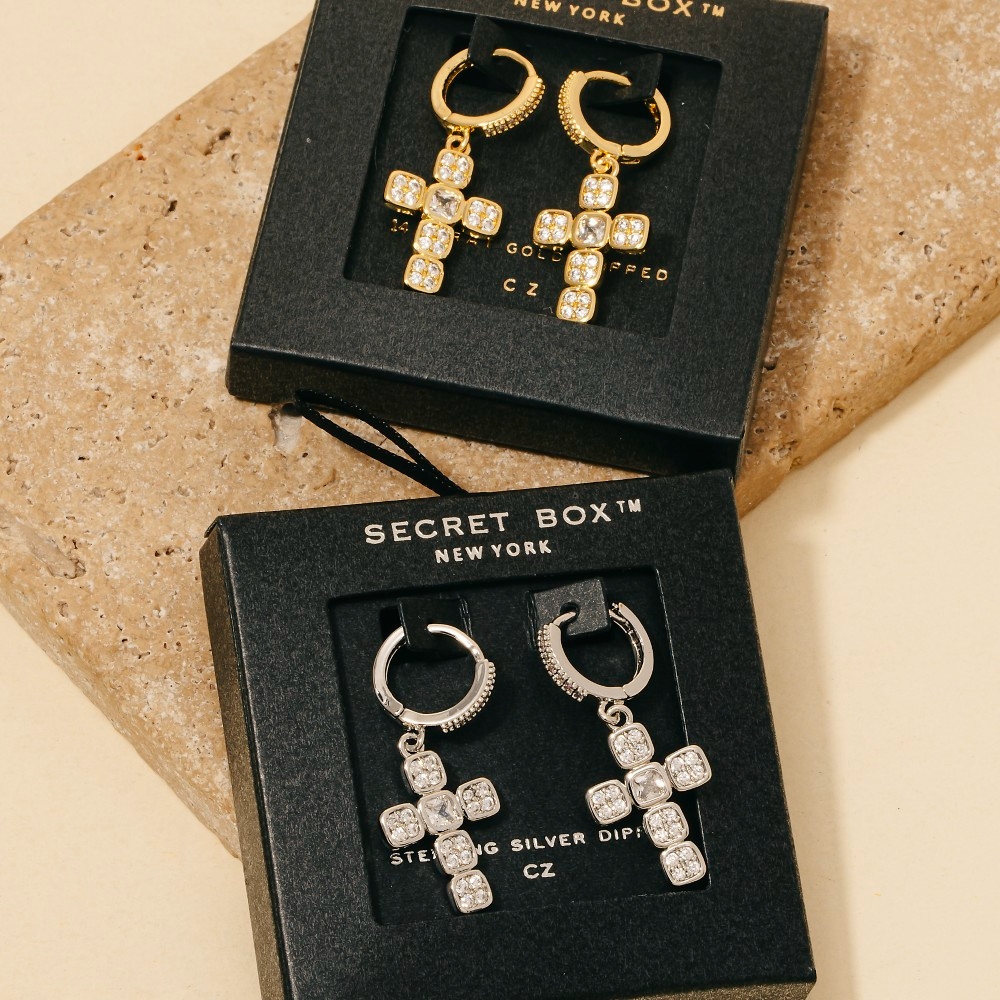• This piece is perfect for those who want to showcase their unique style, this pair of hoop earrings showcases a breathtaking secret box gold dipped cubic zirconia cross charm design. This item is perfect for adding some color and vibrancy to any outfit. Available in GD, WG. This item is sold in packs of 1.
