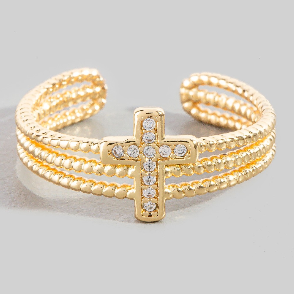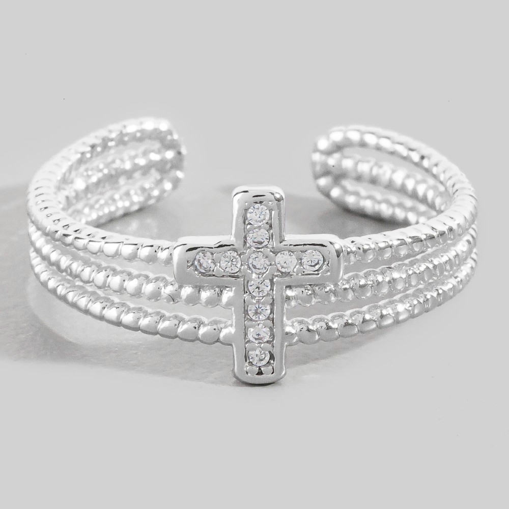 • A versatile piece that can be dressed up or down, this ring emanates an elegant three row cubic zirconia cross design. Transform your outfit from ordinary to extraordinary with the touch of elegance provided by this versatile ring. Available in G, X. This item is sold in packs of 1.