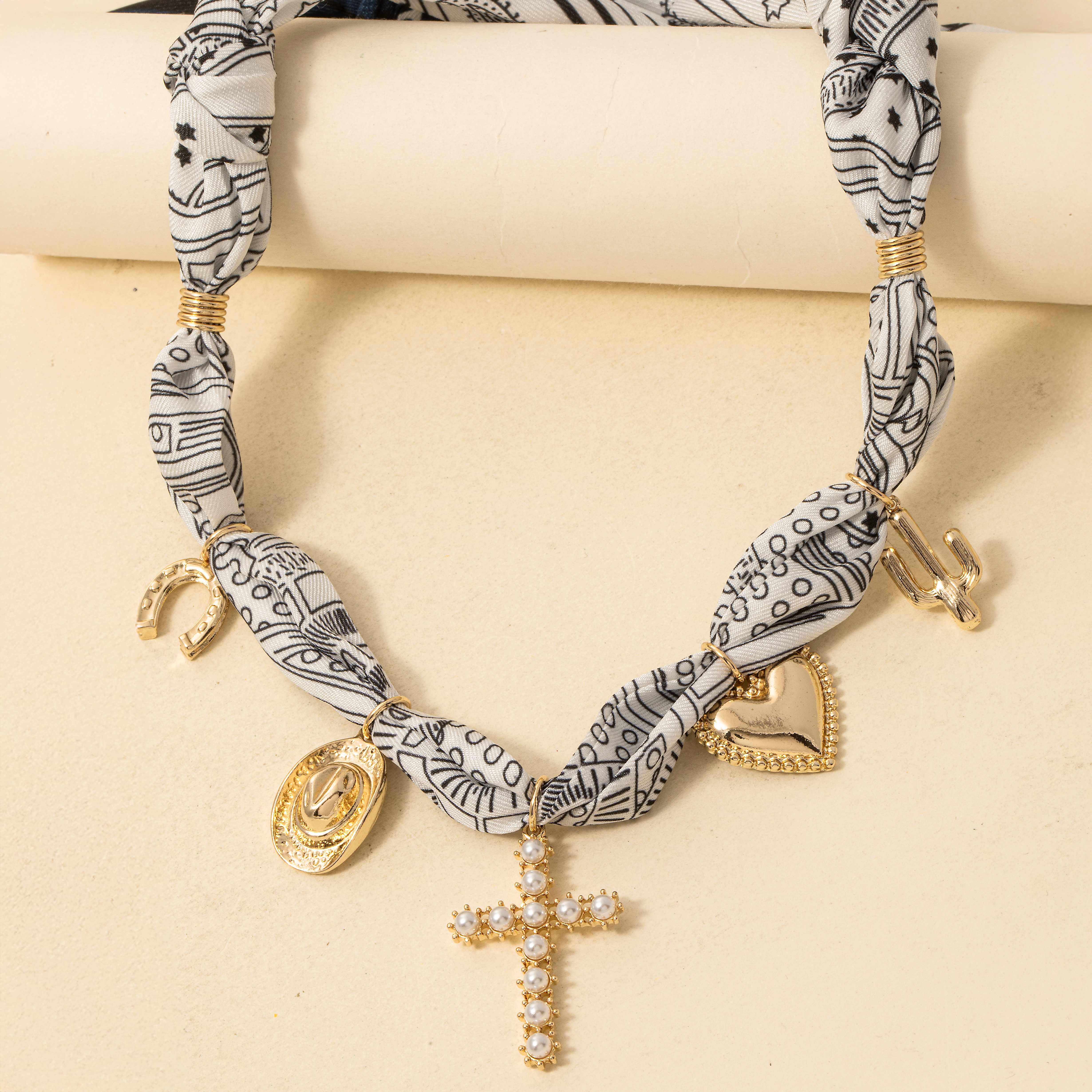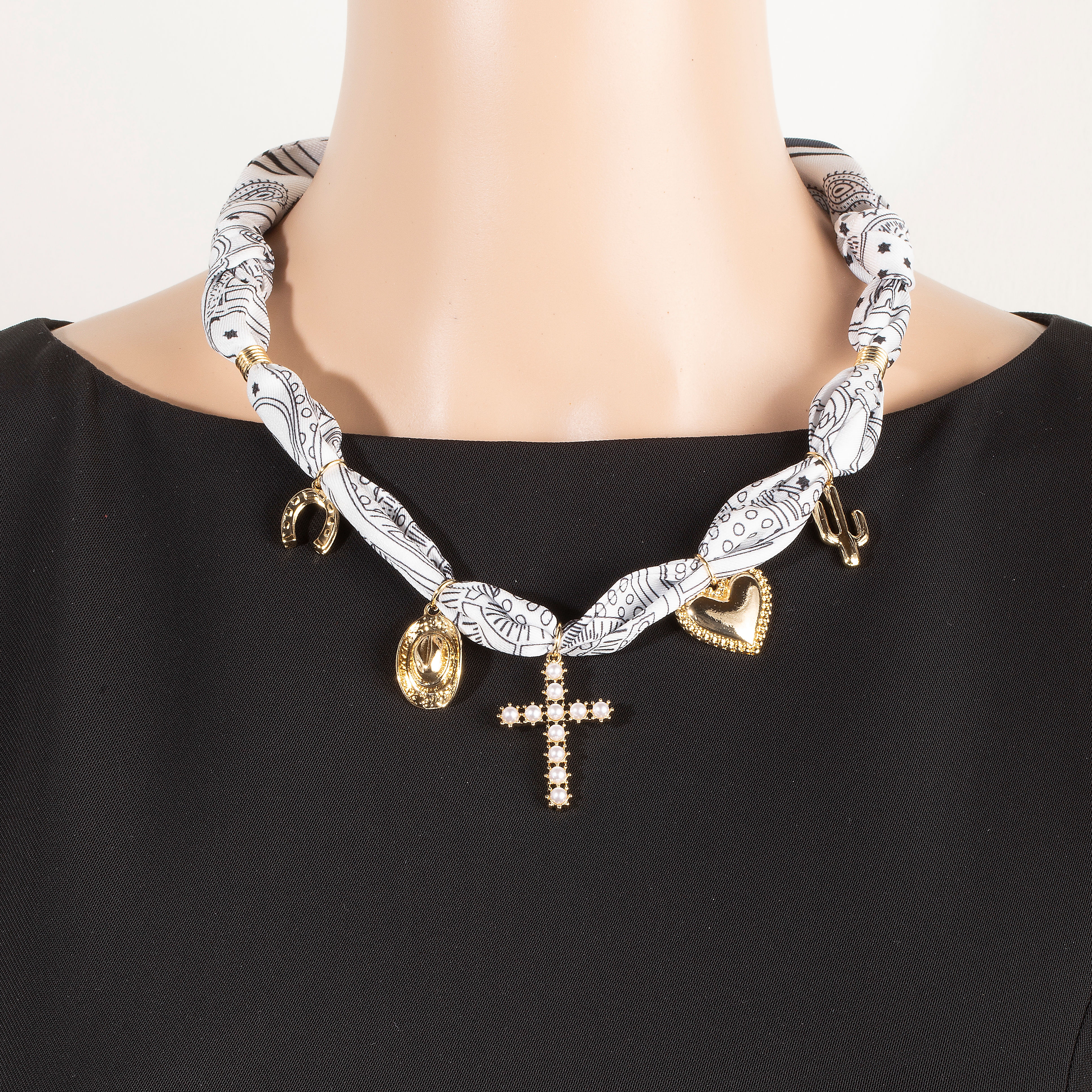 - A versatile and stylish addition to any wardrobe, this necklace flaunts a luxurious western heart and pearl cross charms bandana design. Transform your outfit into a fashion masterpiece with this versatile necklace, an essential for the style-conscious individual. Available in GDWHTFM. This item is sold in packs of 1.