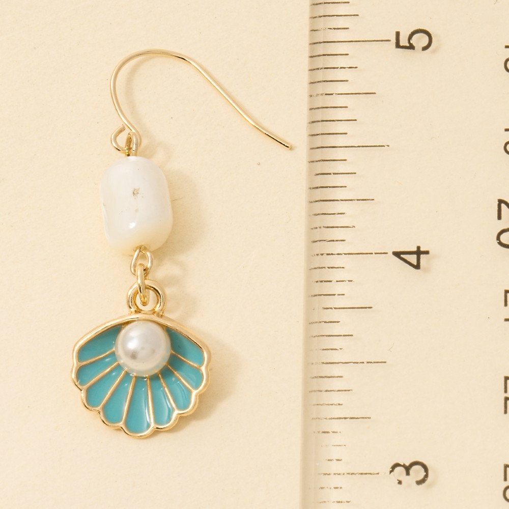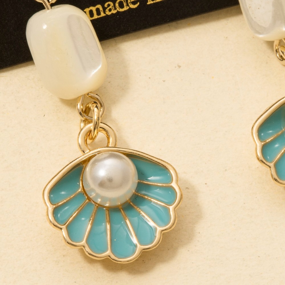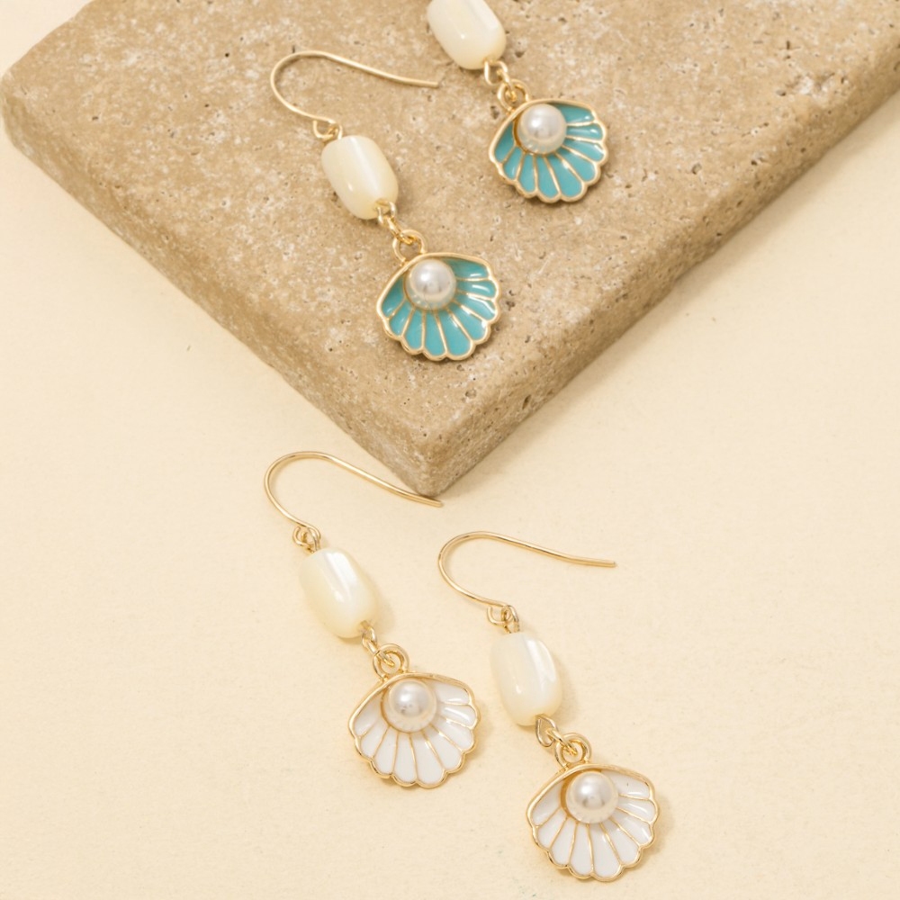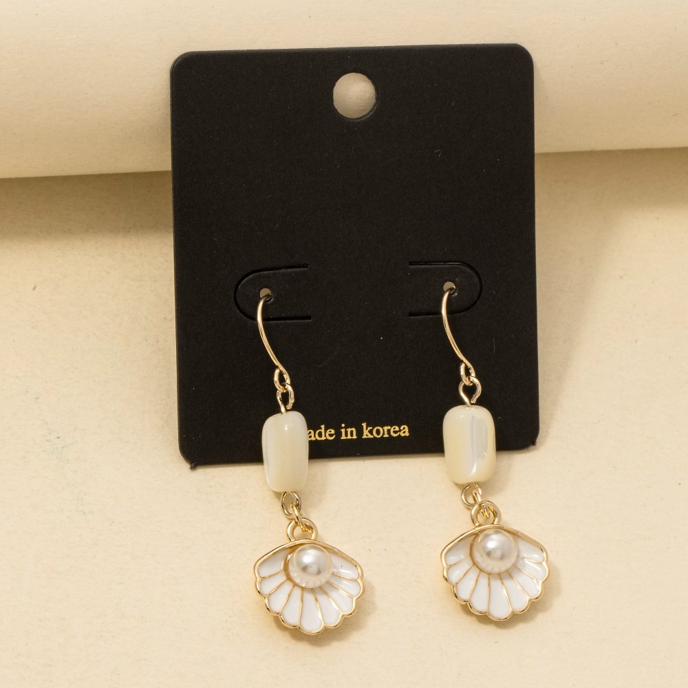 - Unleash your inner fashionista, this pair of drop earrings showcases a breathtaking enamel seashell pearl design. Upgrade your fashion game with this versatile pair of drop earrings, a timeless addition that complements any outfit seamlessly. Available in MI, WH. This item is sold in packs of 1.