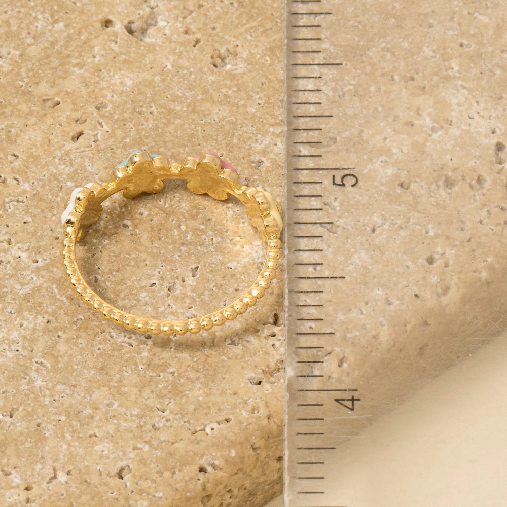 • Effortlessly chic and always on-trend, this ring showcases an alluring gold dipped enamel flower station design. Take your style to the next level by incorporating this versatile ring, a key element in achieving a polished look. Available in G. This item is sold in packs of 1.