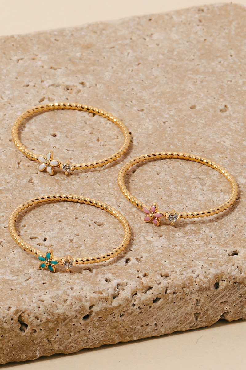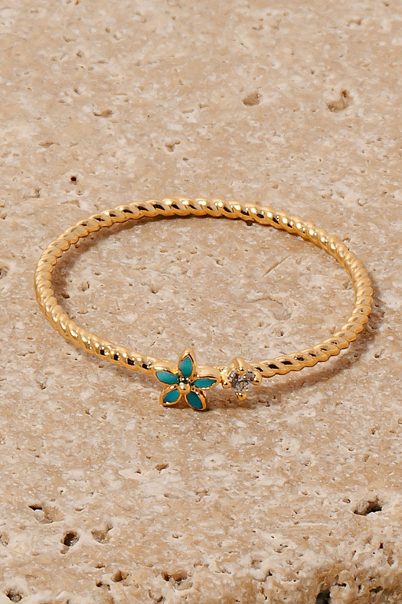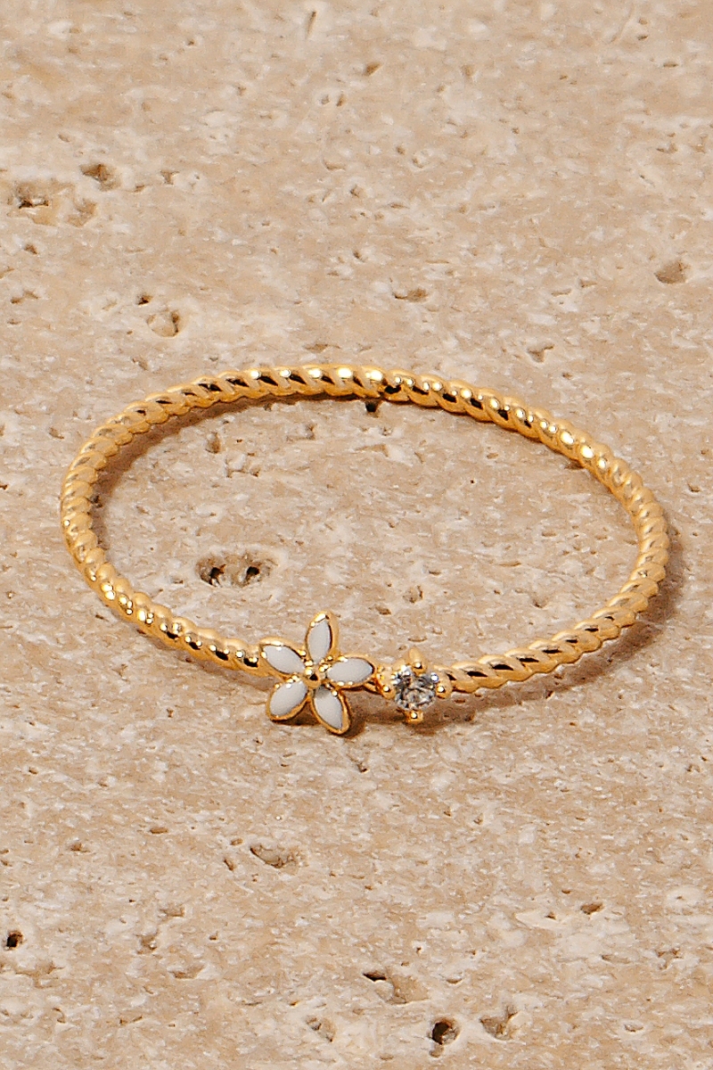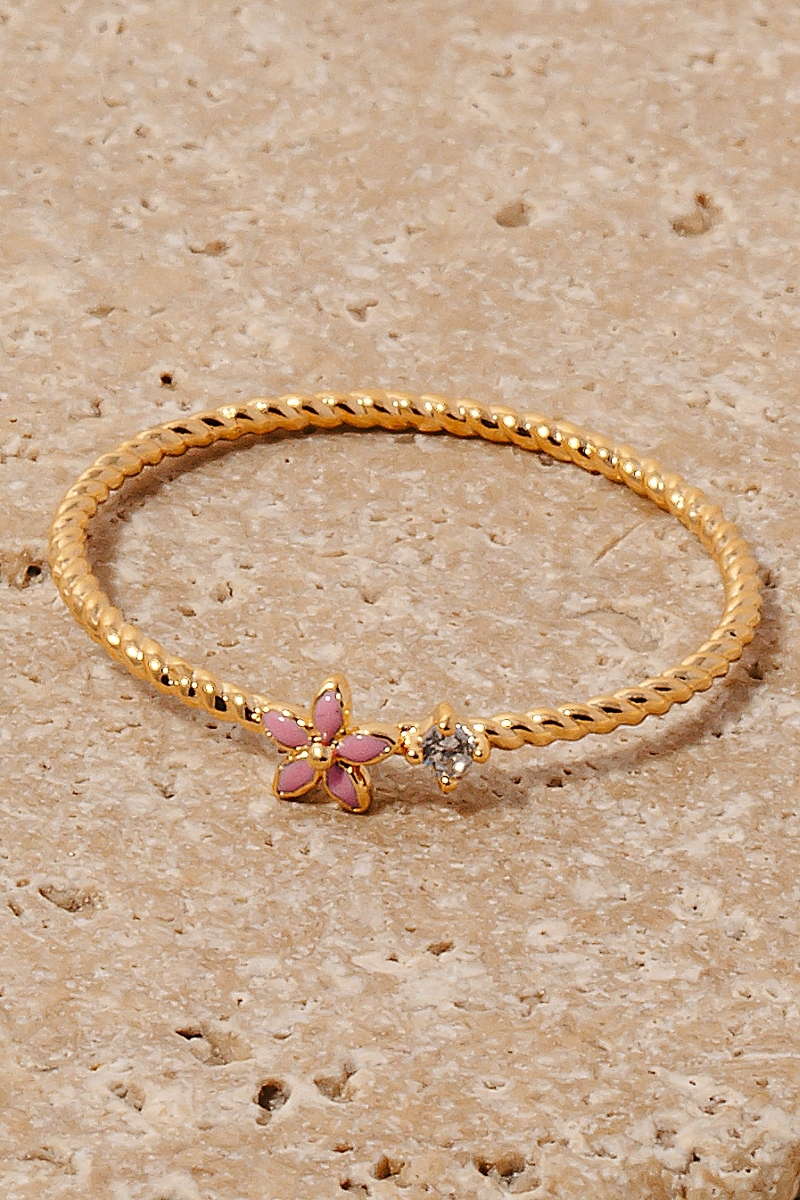 • This ring displays a vibrant mini cubic zirconia and enamel flower rope band style. Experience a subtle blend of modernity and classic charm as this ring effortlessly adorns your ensemble.
