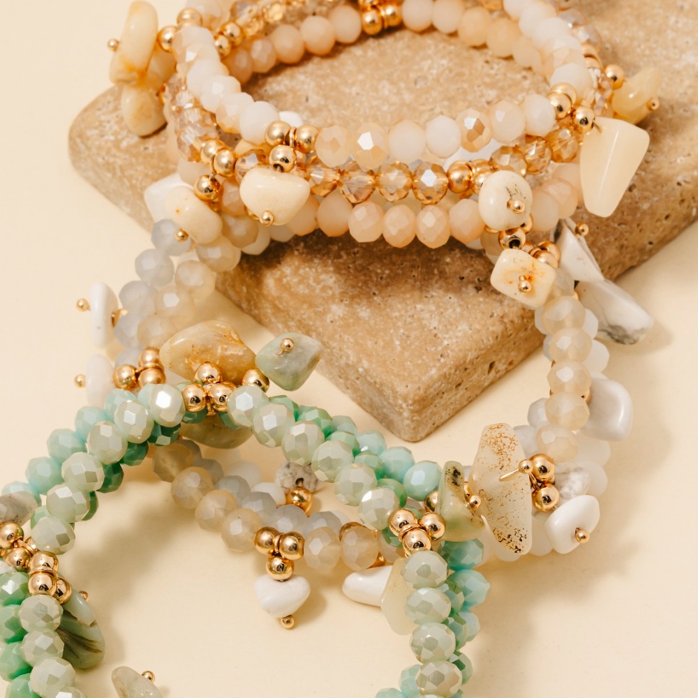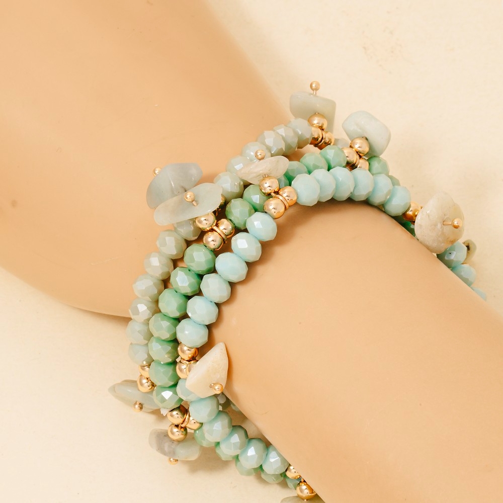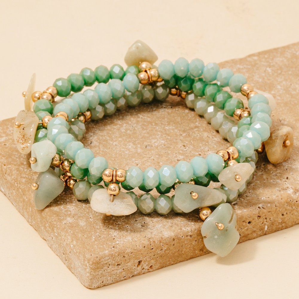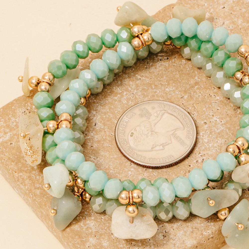 • Perfect for any fashion-forward individual, this bracelet displays a unique stone charms faceted beaded set design. Perfect for adding a pop of color or texture to any outfit, this bracelet is a must-have. Available in GDMINT, GDNAT, GDWHT. This item is sold in packs of 1.