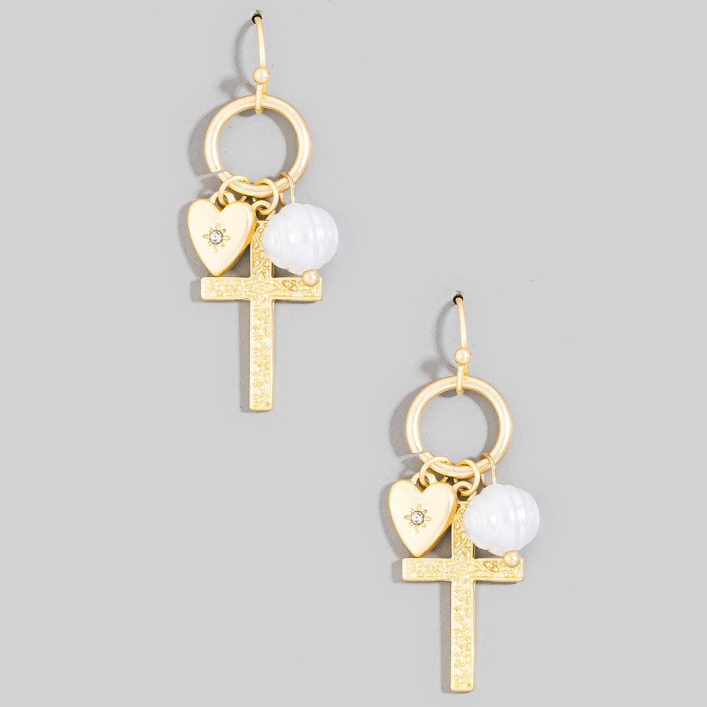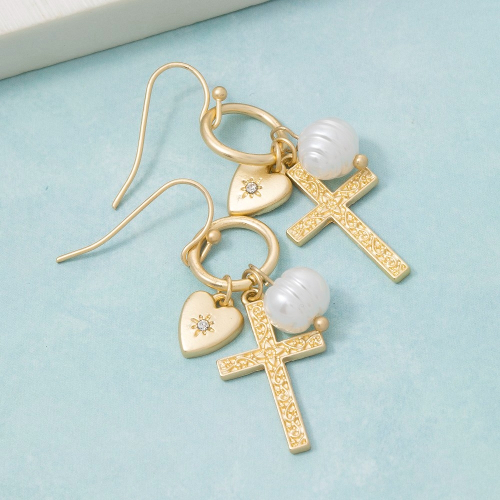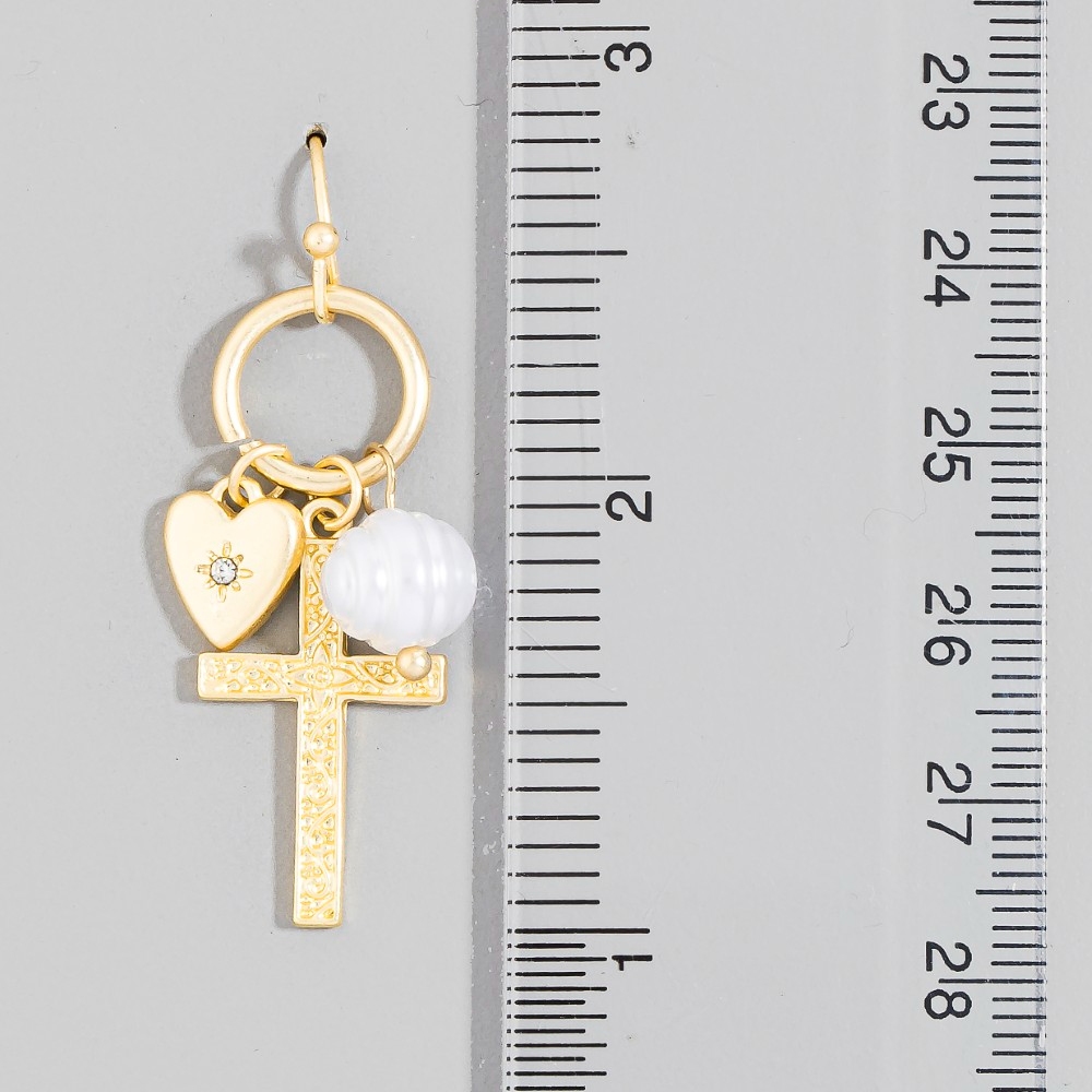 Perfectly versatile and endlessly stylish, this pair of dangle earrings comes with a special cross pearl and heart charms design. Make a lasting impression with this versatile pair of dangle earrings, a subtle yet impactful addition to your fashion repertoire. Available in GD. This item is sold in packs of 1.