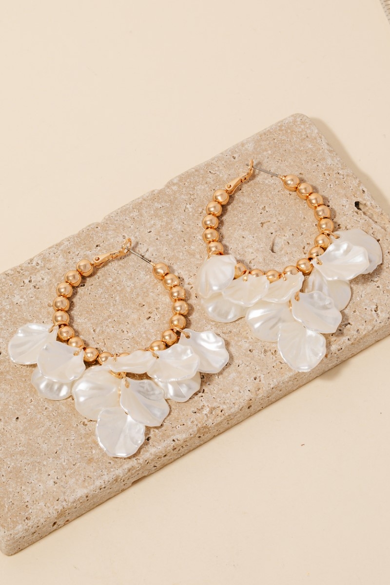 • This pair of hoop earrings showcases a timeless pearl petal charms beaded latch style. Step into a world of refined taste as this pair of hoop earrings effortlessly refines the details of your outfit.