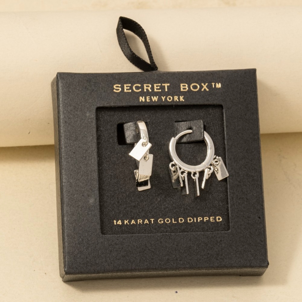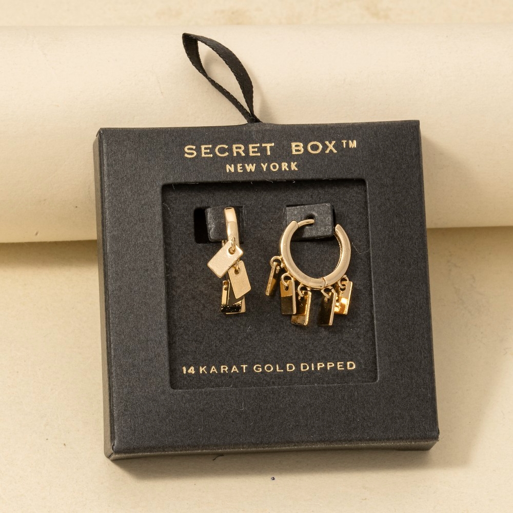 • Add a touch of elegance and glamour to your look, this pair of hoop earrings reveals an intricate secret box gold dipped tag charms design. Make a lasting impression with this versatile pair of hoop earrings, a subtle yet impactful addition to your fashion repertoire. Available in GD, WG. This item is sold in packs of 1.