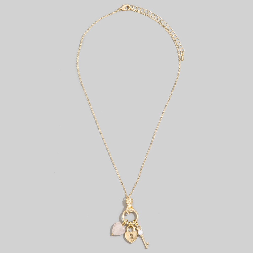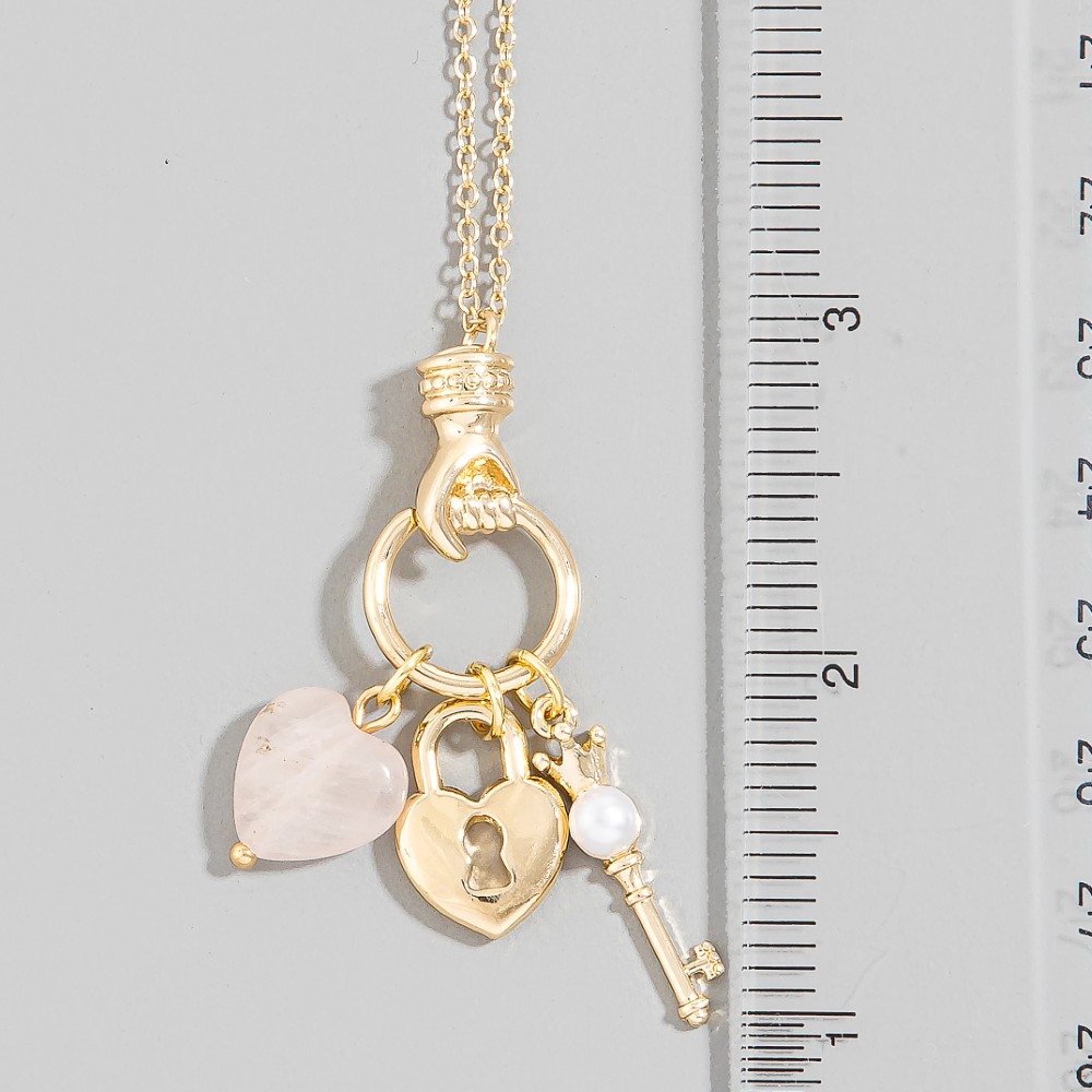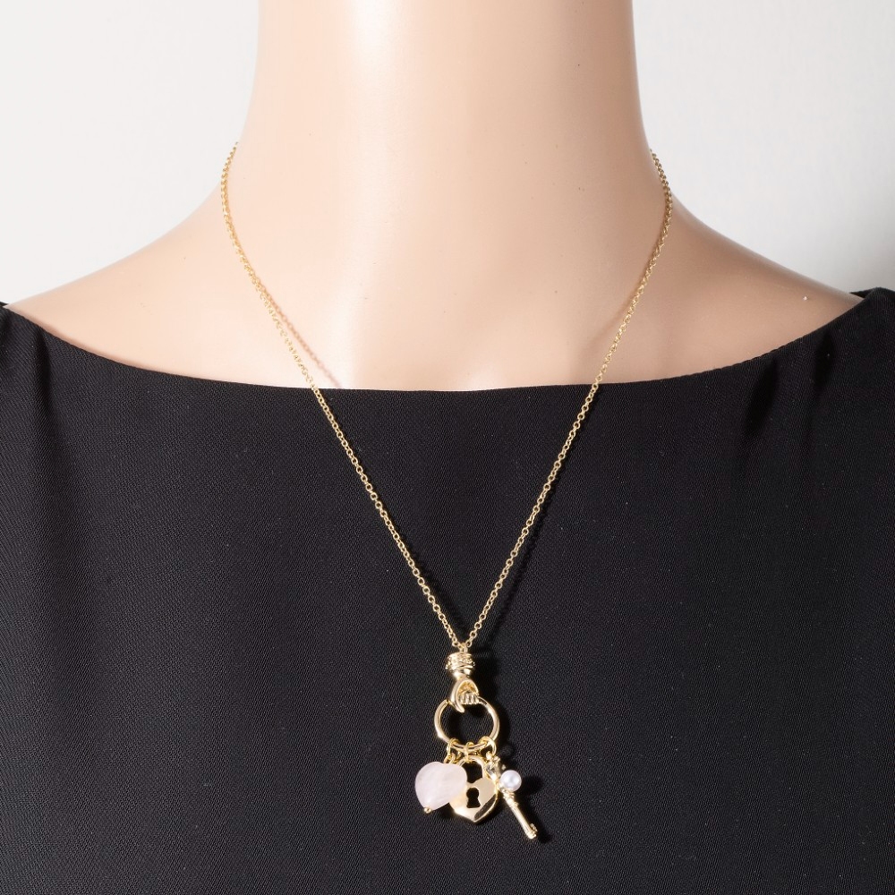 • A classic design with a contemporary twist, this chain necklace embodies a sophisticated heart lock and key charms design. Perfect for dressing up or down, this versatile chain necklace adds a touch of sophistication to any look. Available in GDRQ. This item is sold in packs of 1.