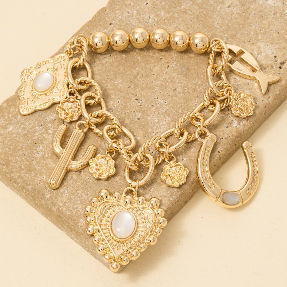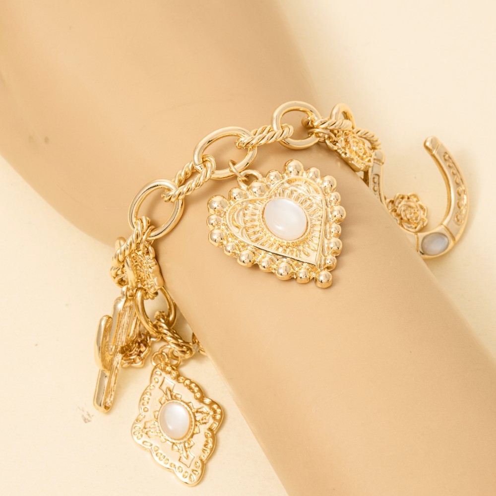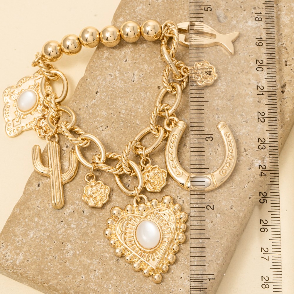• This piece is designed to make a statement, this chain bracelet embodies a sophisticated mixed western themed charms design. The perfect way to elevate any outfit, this chain bracelet adds a touch of elegance and style. Available in G. This item is sold in packs of 1.