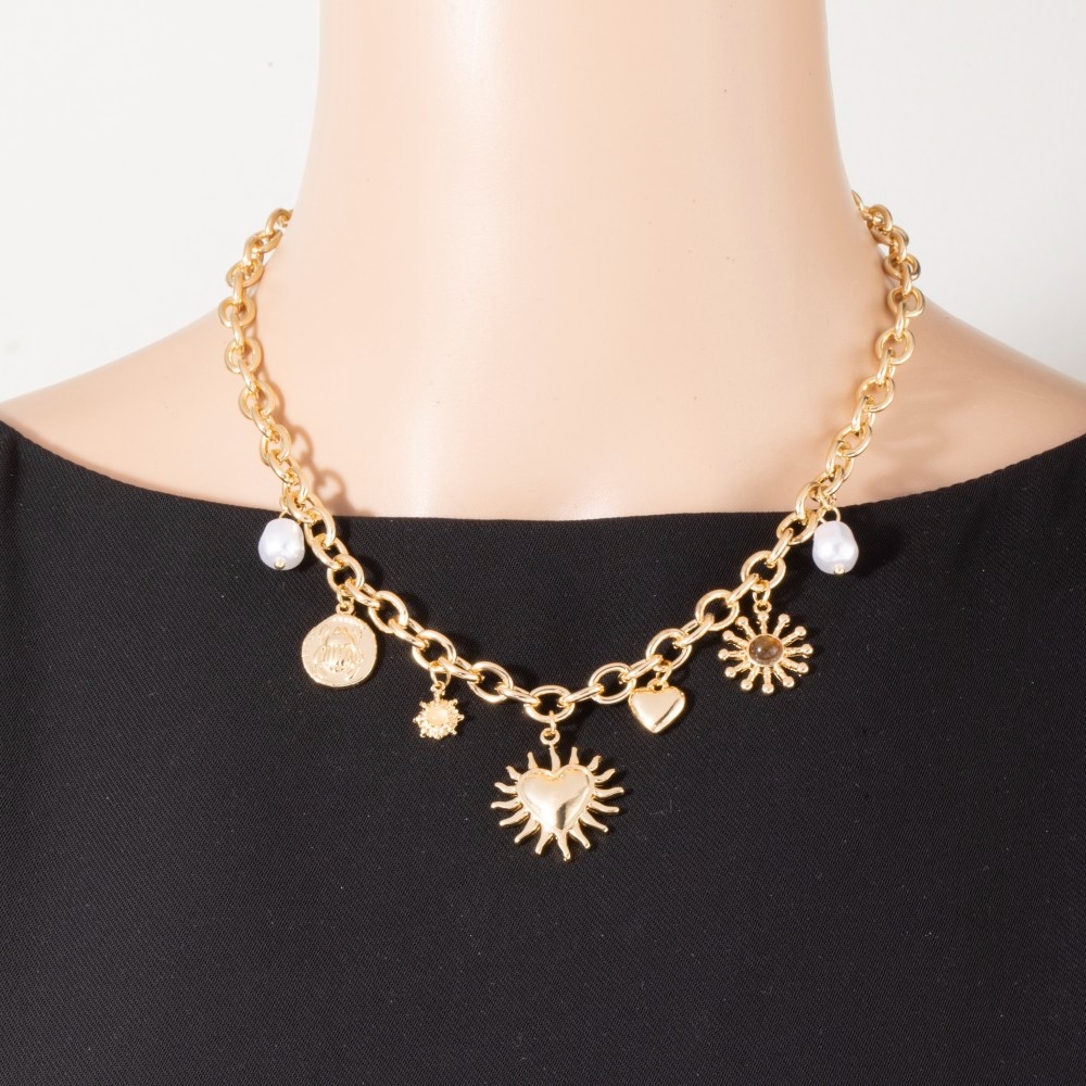 • An instant wardrobe staple, this chain necklace adds a distinctive mixed heart and pearl charms design. Redefine your fashion identity with this versatile chain necklace, a timeless piece that complements any wardrobe. This item is sold in packs of 1.