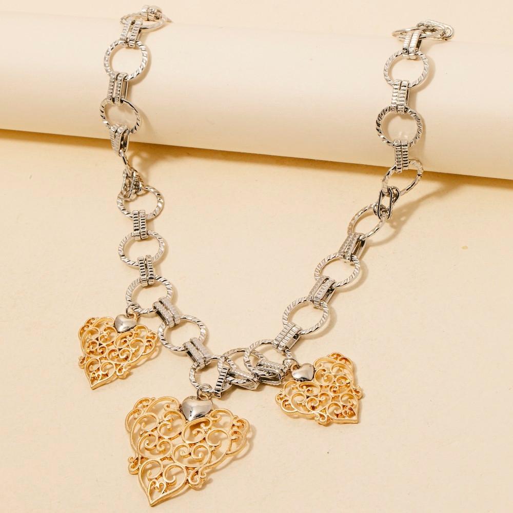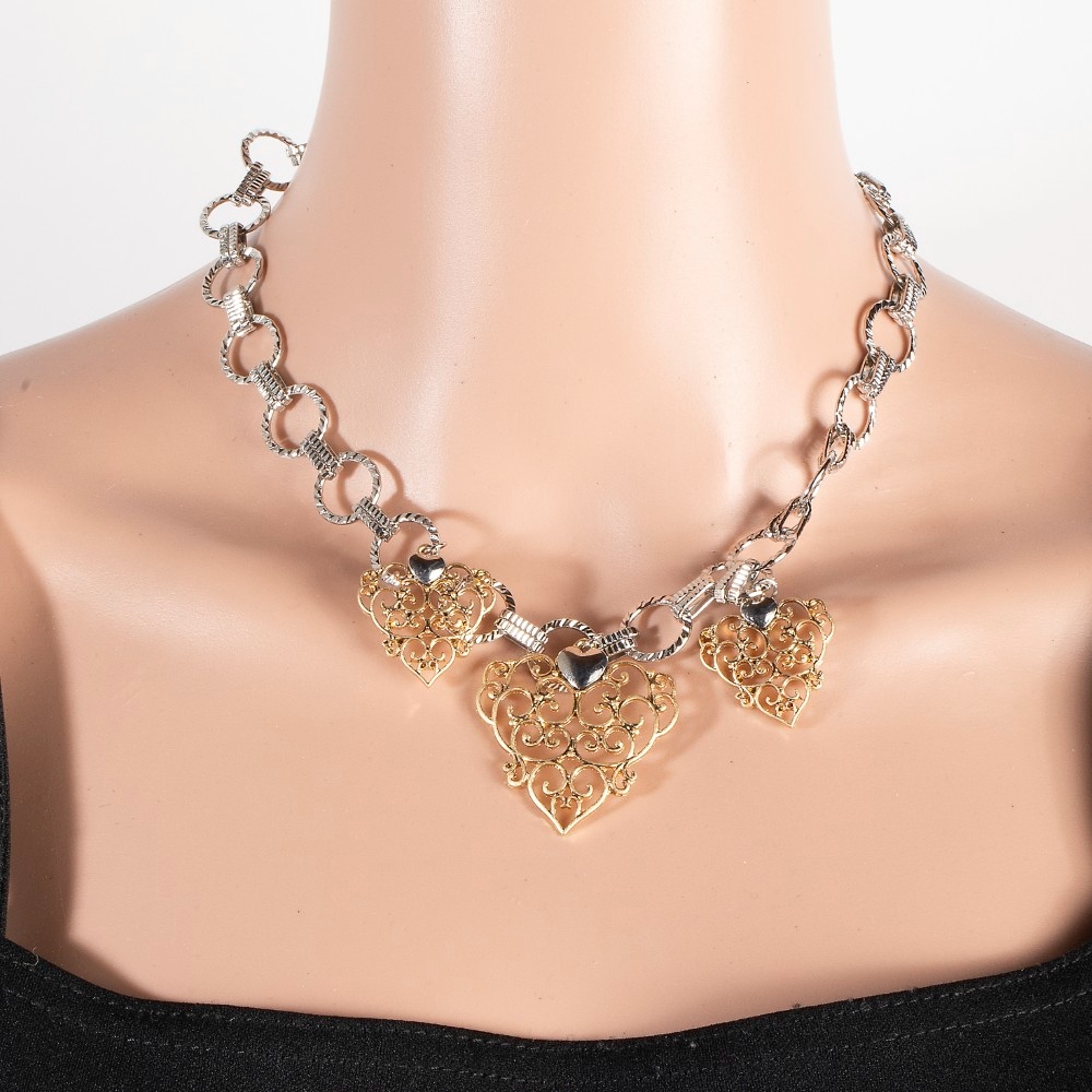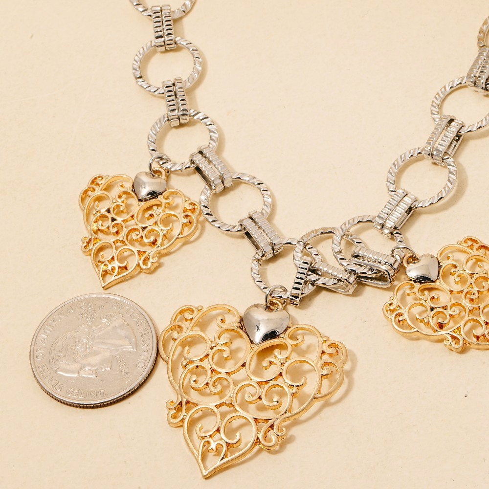 • This piece is both elegant and versatile, this necklace introduces an exceptional two tone chain and filigree hearts charms design. This necklace is ideal for both casual and formal events, adding a touch of sophistication to any outfit. Available in RHWG. This item is sold in packs of 1.