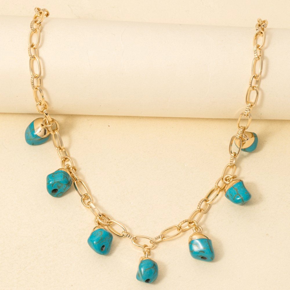 • A must-have for any fashion-forward individual, this chain necklace embodies a sophisticated turquoise stone charms design. Achieve a perfect blend of style and sophistication with this versatile chain necklace, a fashion-forward choice for any occasion. Available in TUR. This item is sold in packs of 1.