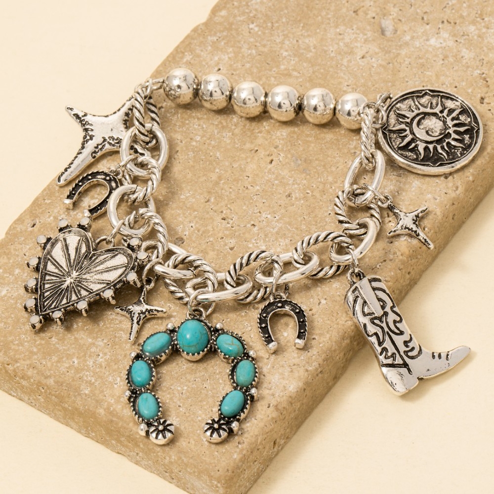 • A piece that will never go out of style, this chain bracelet introduces an exceptional turquoise studded western themed charms design. Transform your outfit into a fashion masterpiece with this versatile chain bracelet, an essential for the style-conscious individual. Available in VG2, VS2. This item is sold in packs of 1.