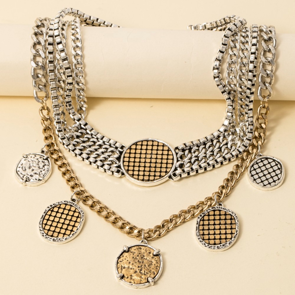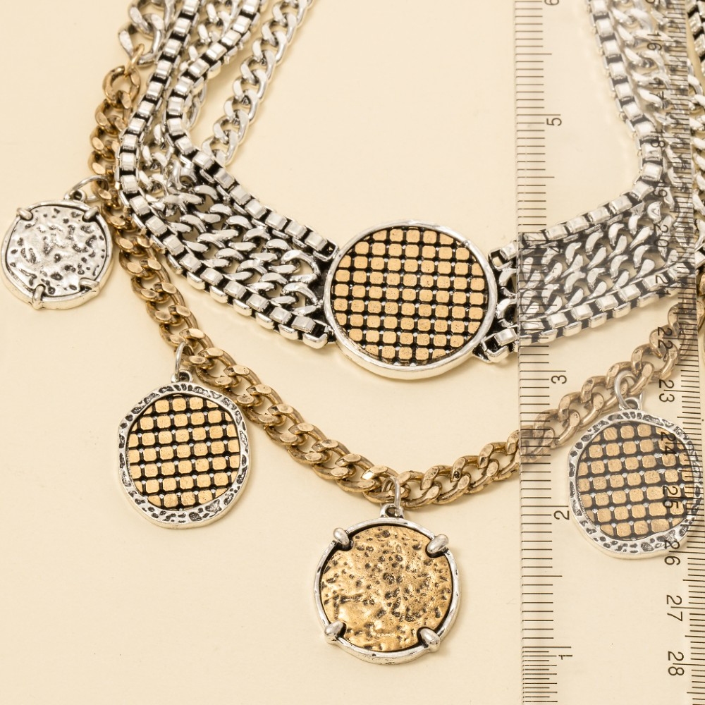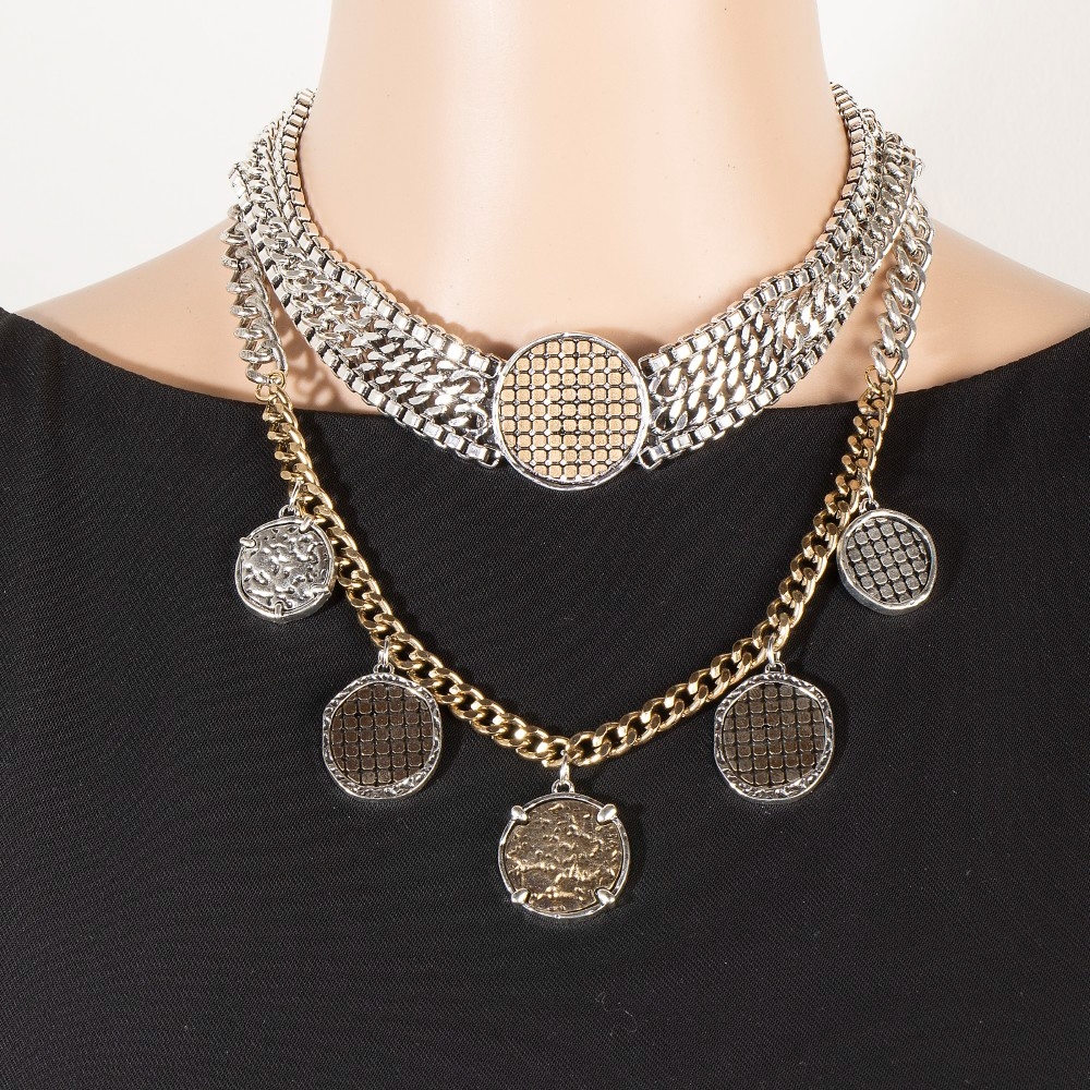 • This piece is the perfect way to add some glamour to your look, this necklace displays a unique two tone coin charms layered chain statement design. Unleash the potential of your wardrobe with this versatile necklace, ensuring a touch of elegance in every ensemble. Available in GS. This item is sold in packs of 1.