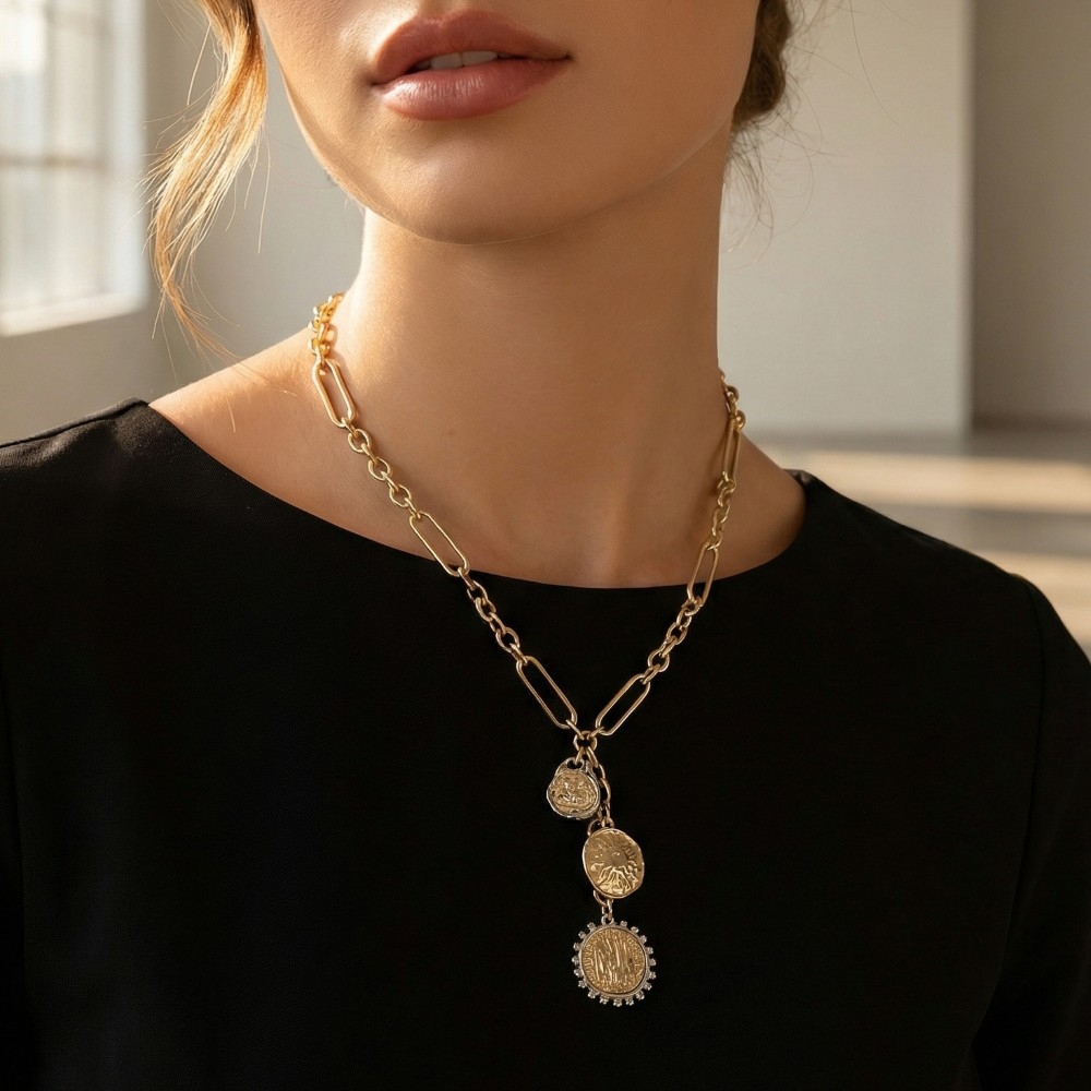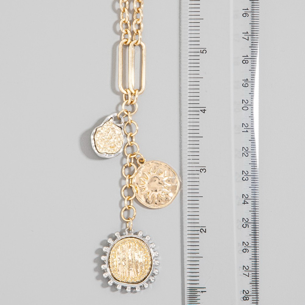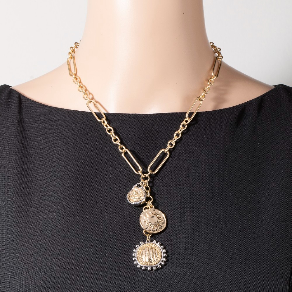 • Make a statement, this chain necklace comes with a special two tone multi coin charms y design. Redefine your wardrobe with this versatile chain necklace, a timeless addition that brings an air of sophistication to any look. Available in GDRH. This item is sold in packs of 1.