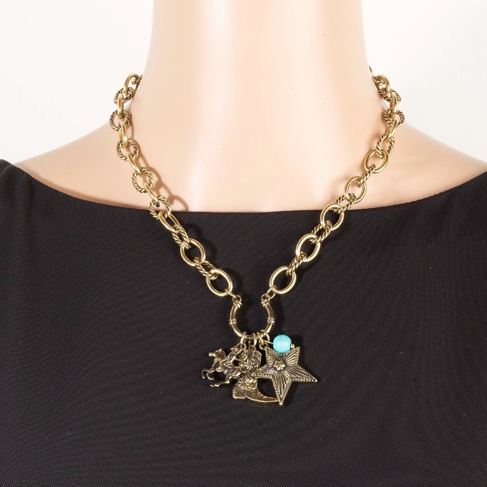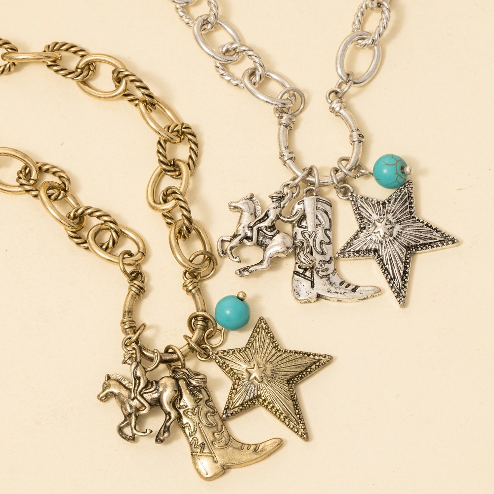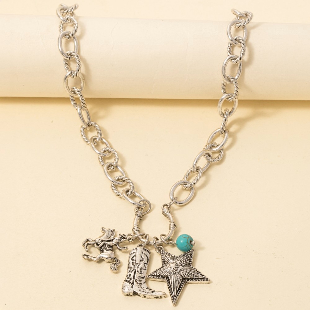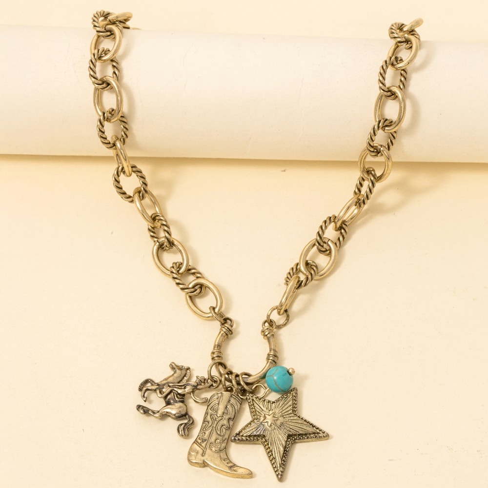 • Upgrade your chain necklace game, this chain necklace showcases a breathtaking western cowboy boot and star pendants design. A stylish chain necklace that's perfect for complementing your favorite outfit. Available in VG, VS. This item is sold in packs of 1.