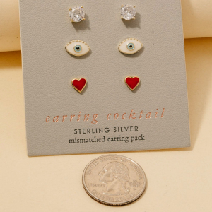 Enamel Heart Evil Eye And Cz Gem Stud Earrings Set