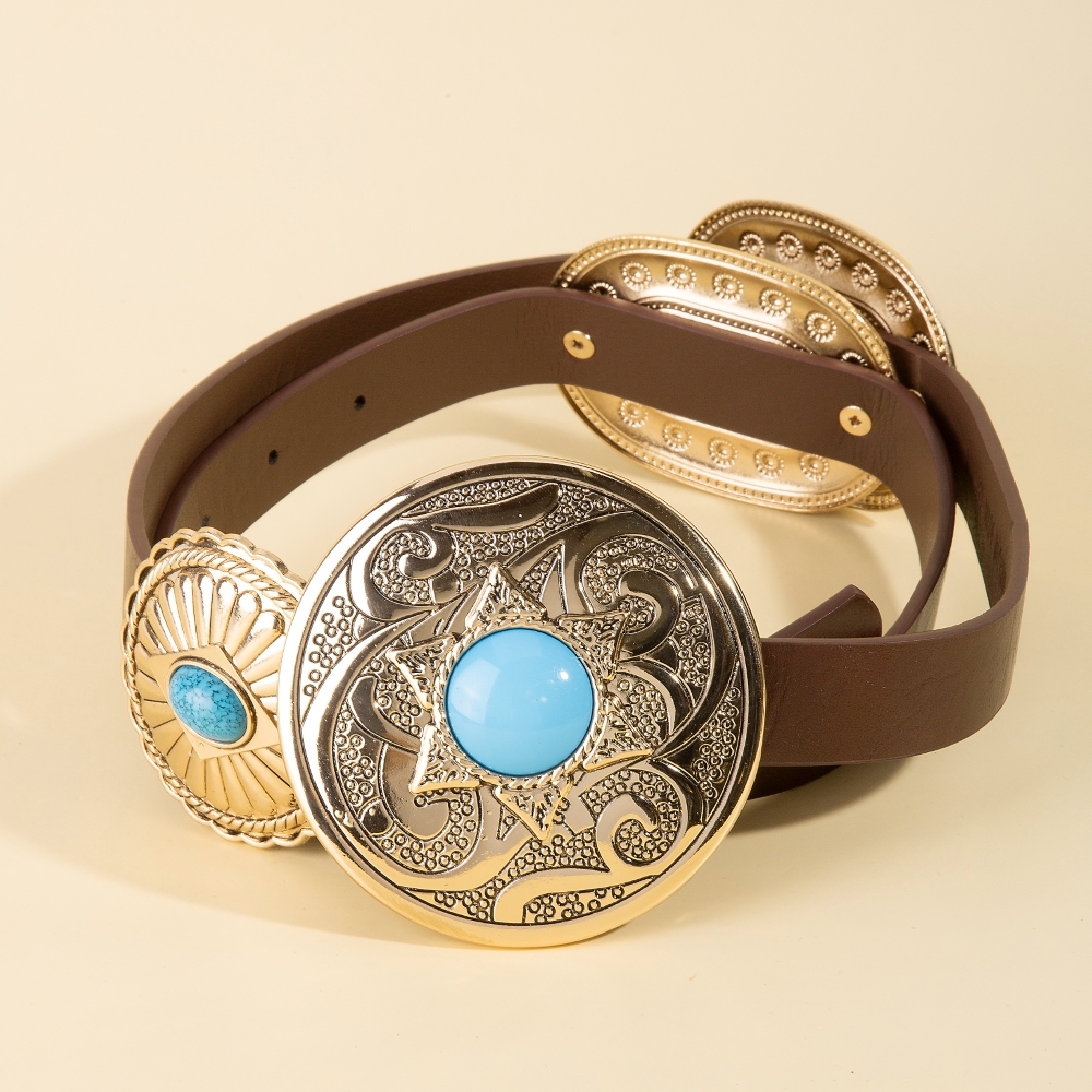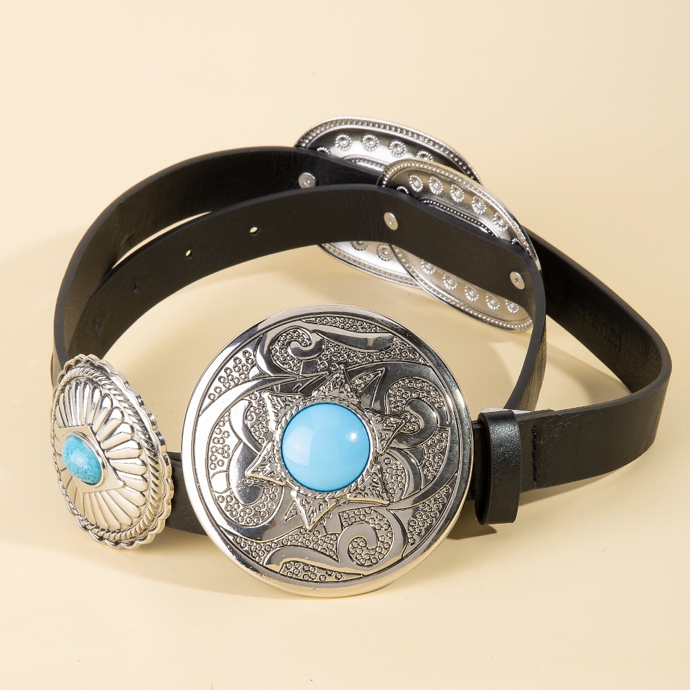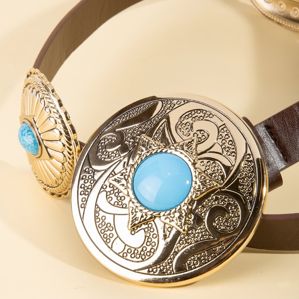 Guaranteed to add a touch of glamour to any outfit, this leather belt encompasses a grand western concho accent vegan design. The perfect way to complete any outfit, whether you're dressing up or keeping it casual. Available in GBKBK, GCOBL, SBKBL. This item is sold in packs of 1.