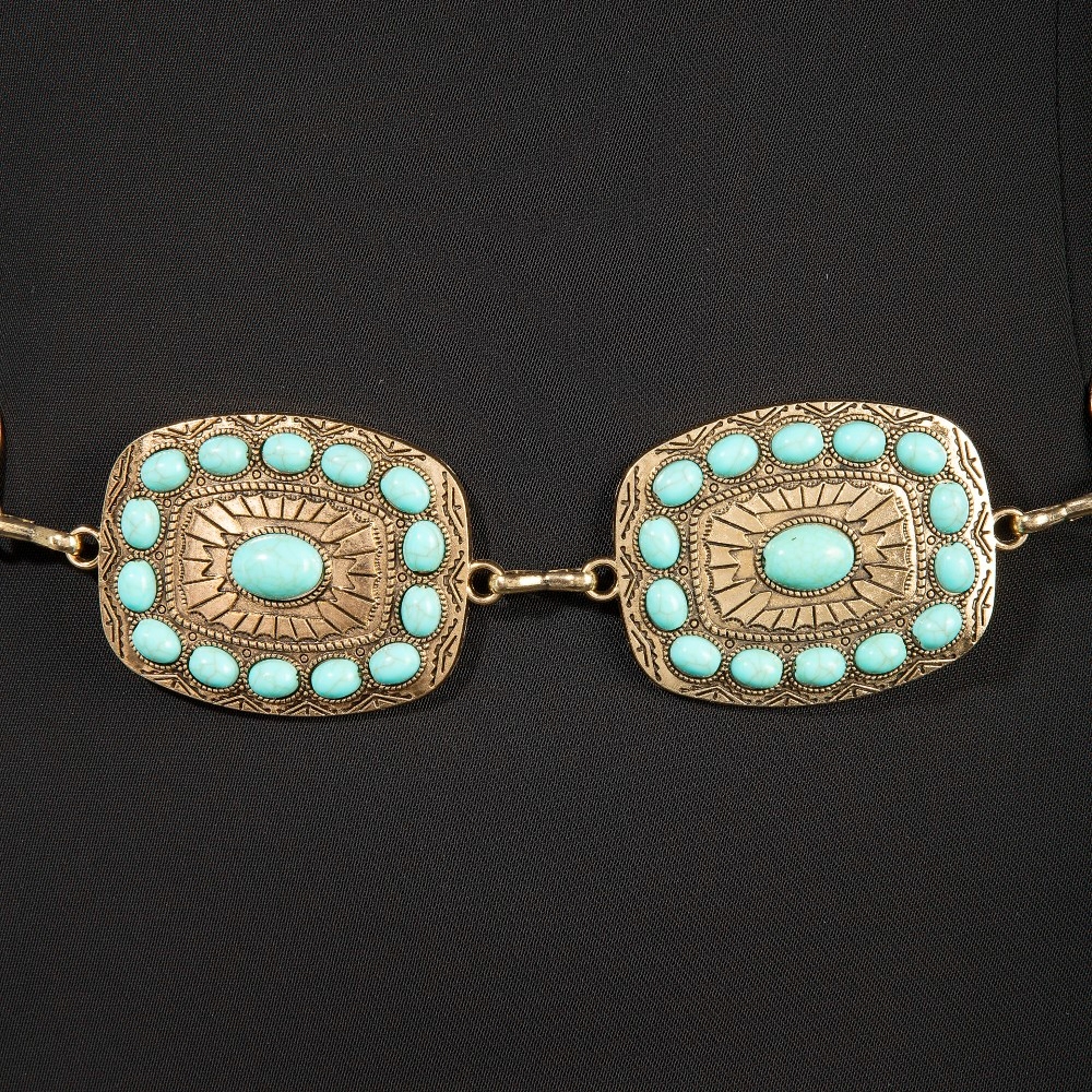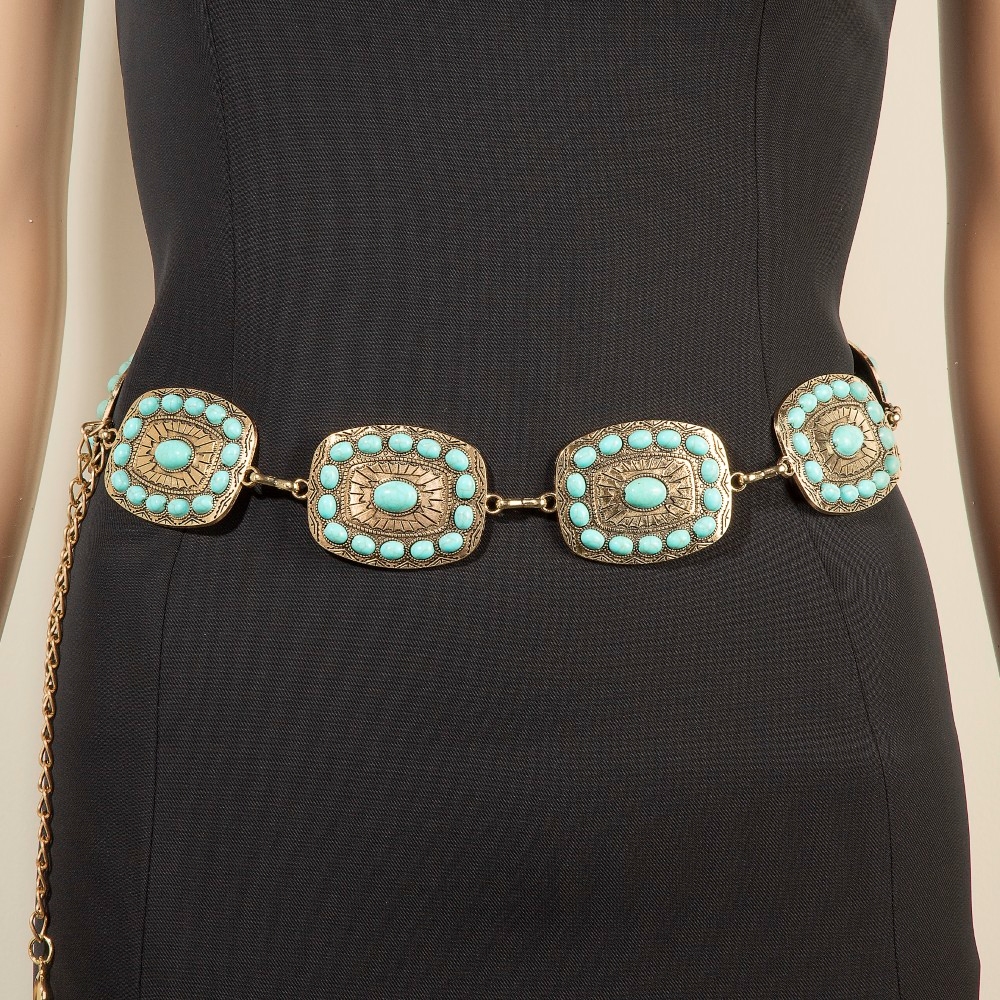 • Guaranteed to add a touch of glamour to any outfit, this chain belt incorporates a flawless western turquoise round studded rectangle concho design. Transform your outfit into a fashion masterpiece with this versatile chain belt, an essential for the style-conscious individual. Available in G, S. This item is sold in packs of 1.