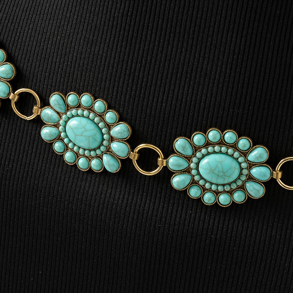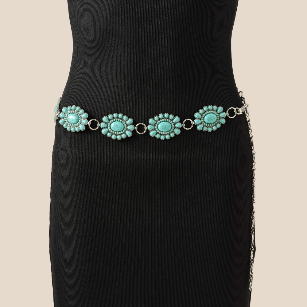 A versatile and stylish addition to any wardrobe, this chain belt shows off a distinctive western turquoise stone bead concho disc design. Elevate your outfit with this stylish chain belt that's perfect for any occasion. Available in G, S. This item is sold in packs of 1.