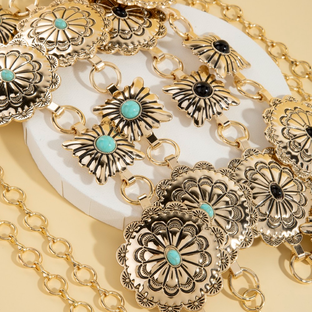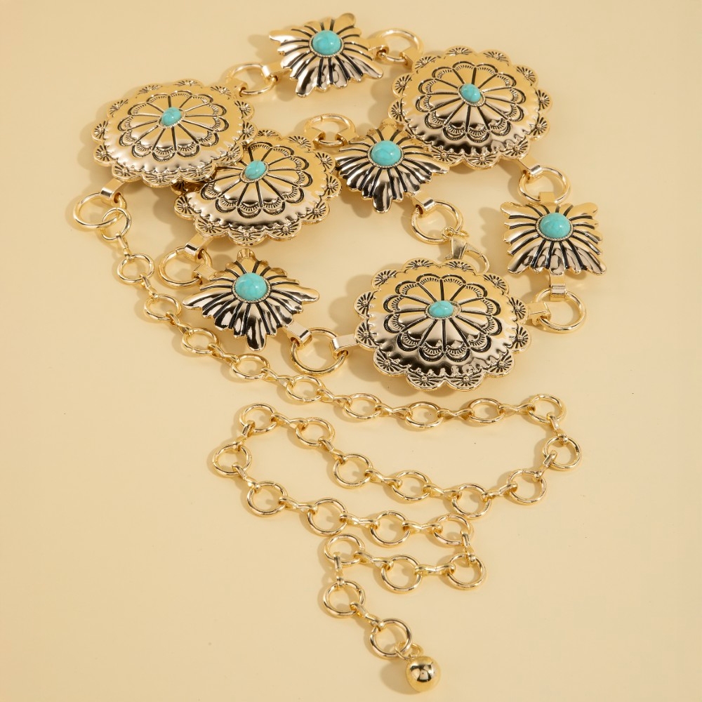 • This season's hottest chain belt, this chain belt introduces an exceptional western turquoise stud floral concho design. Experience the transformative power of this versatile chain belt, effortlessly enhancing the overall aesthetic of your outfit. Available in AGOBK, AGOTQ, ASLBK, ASLTQ. This item is sold in packs of 1.