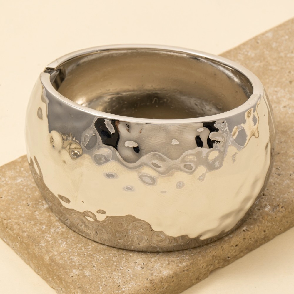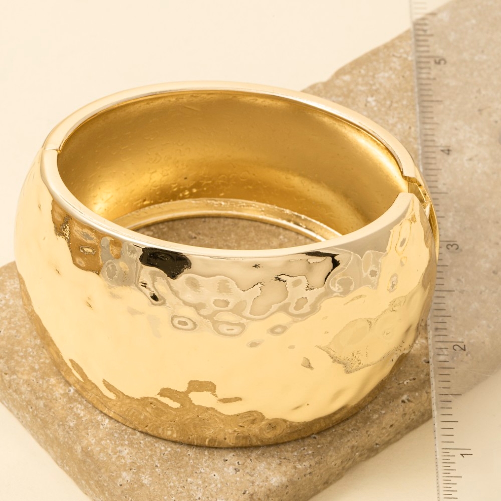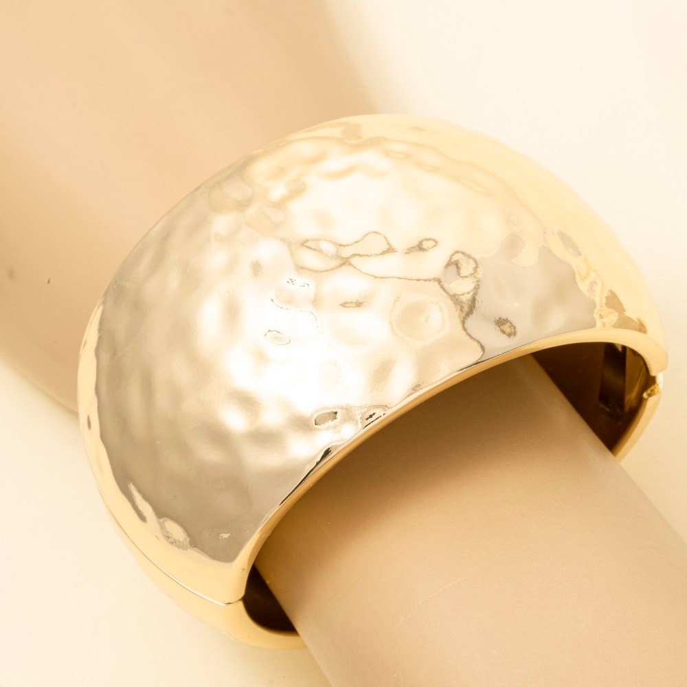 • Effortlessly stylish and always on-trend, this bangle bracelet offers a remarkable hammered wide hinge design. Perfect for adding some texture and dimension to any outfit, this bangle bracelet is a must-have. Available in G. This item is sold in packs of 1.