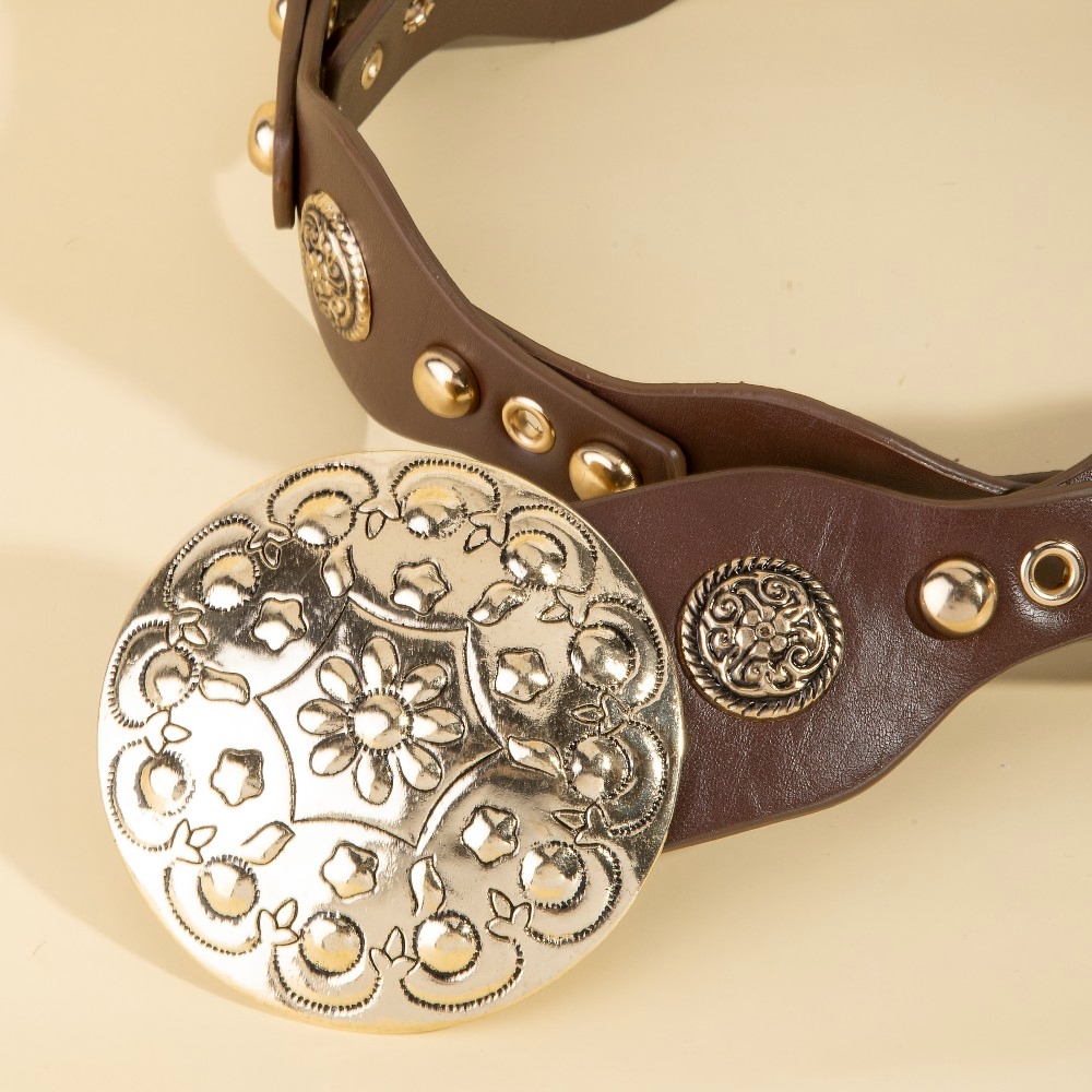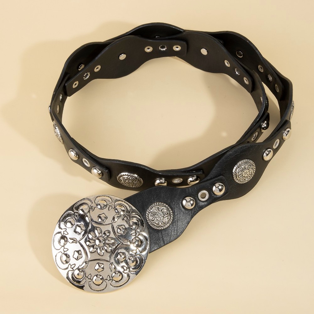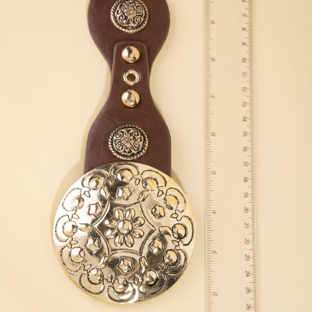• The perfect way to showcase your unique style, this leather belt radiates a sleek ornate large concho disc buckle design. This item is the perfect way to add some texture and interest to any outfit. Available in GBK, GCO, SBK. This item is sold in packs of 1.