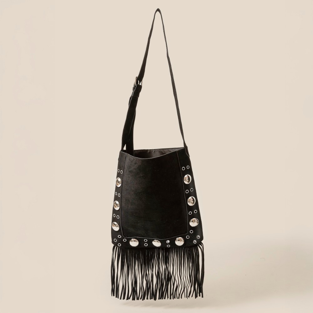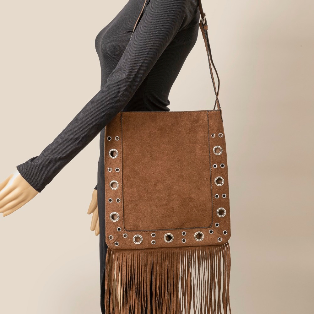 A unique and stylish piece that sets you apart, this tote bag highlights a special faux suede grommet accent fringe design. Unlock endless styling possibilities with this versatile tote bag, creating a signature look that speaks volumes. Available in BK, DBR, LBR, TP. This item is sold in packs of 1.
