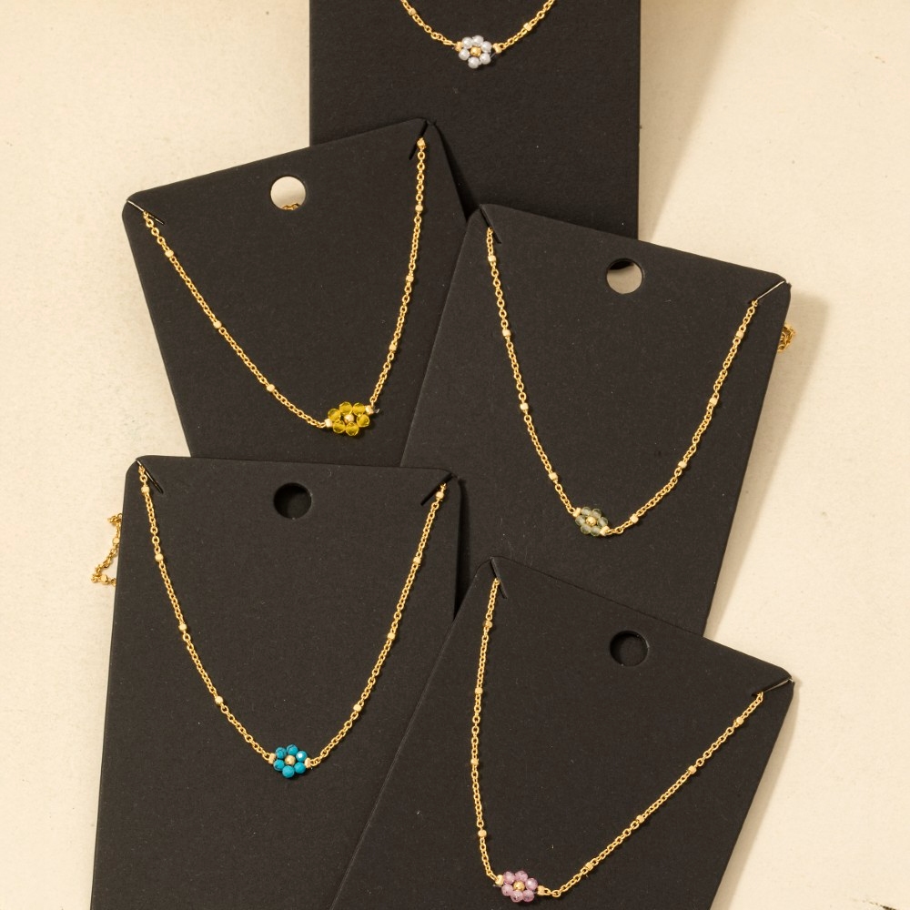 • Stay on-trend and ahead of the fashion curve, this chain necklace flaunts a luxurious beaded flower pendant dainty design. The perfect way to complete any outfit, whether you're dressing up or keeping it casual. Available in OL, PK, PR, TQ, YE. This item is sold in packs of 1.