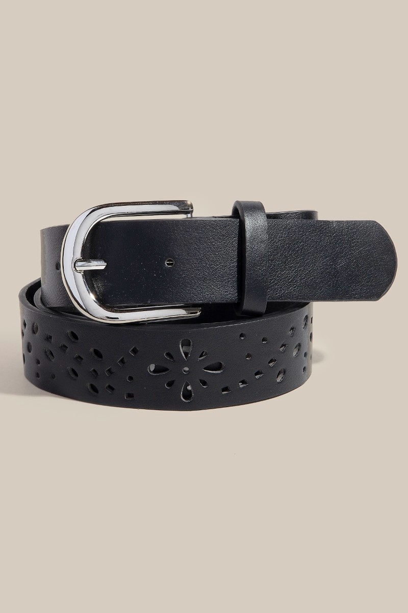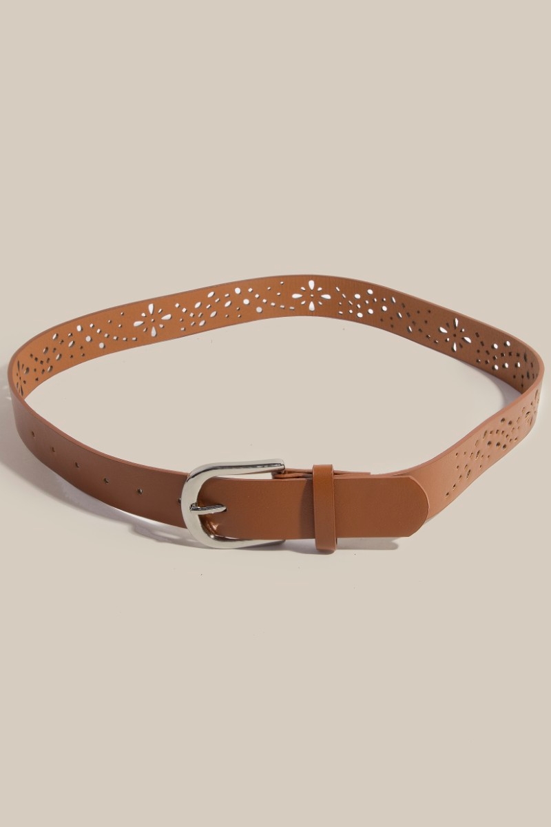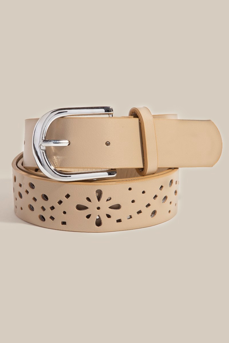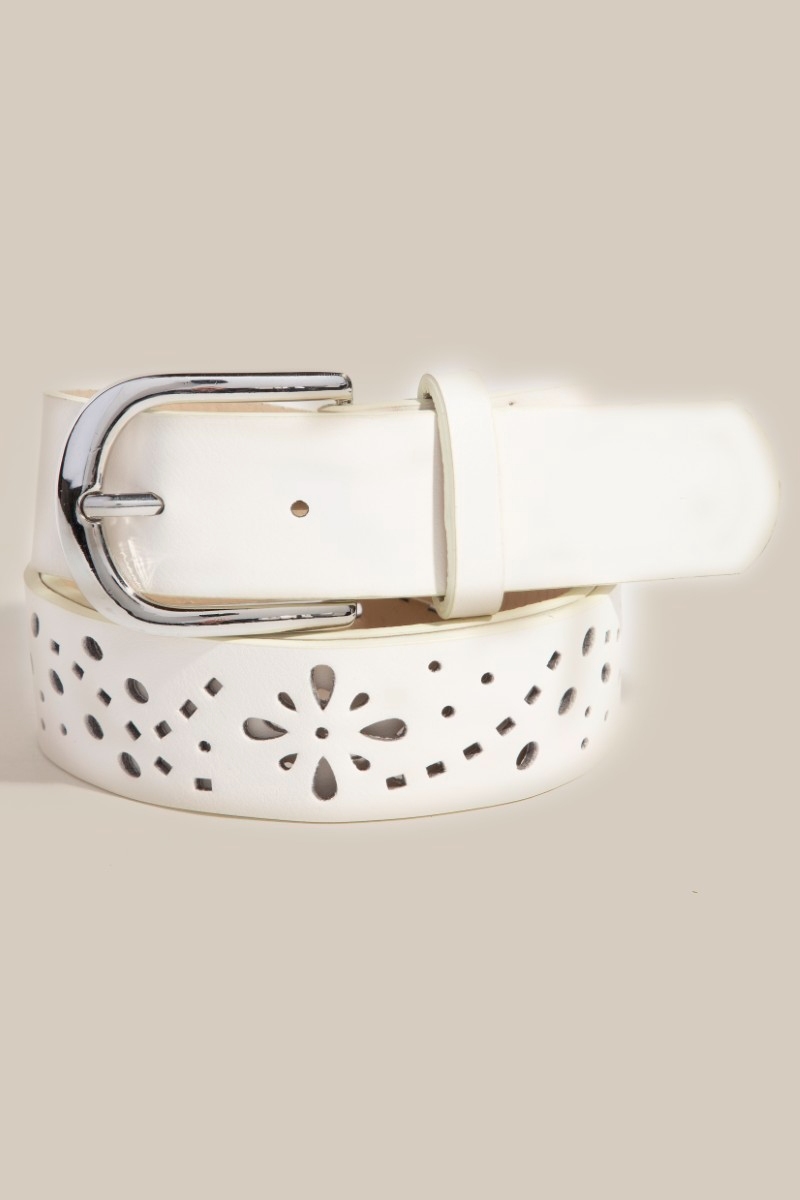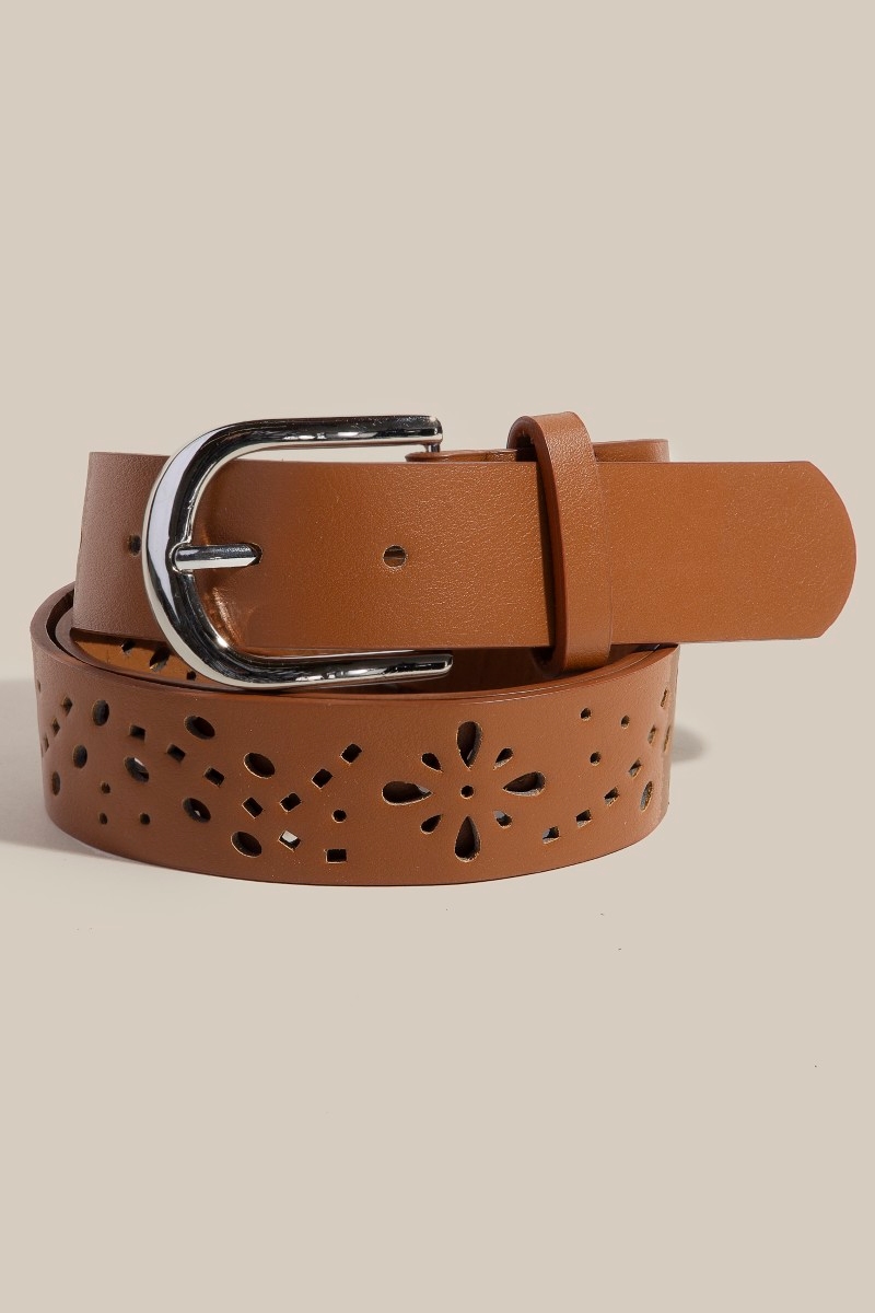 • A timeless piece that you'll wear for years to come, this faux leather belt features an exceptional floral filigree cut out design. This faux leather belt is an effortless way to add some personality to your outfit. Available in BK, BR, IV, KA. This item is sold in packs of 1.
